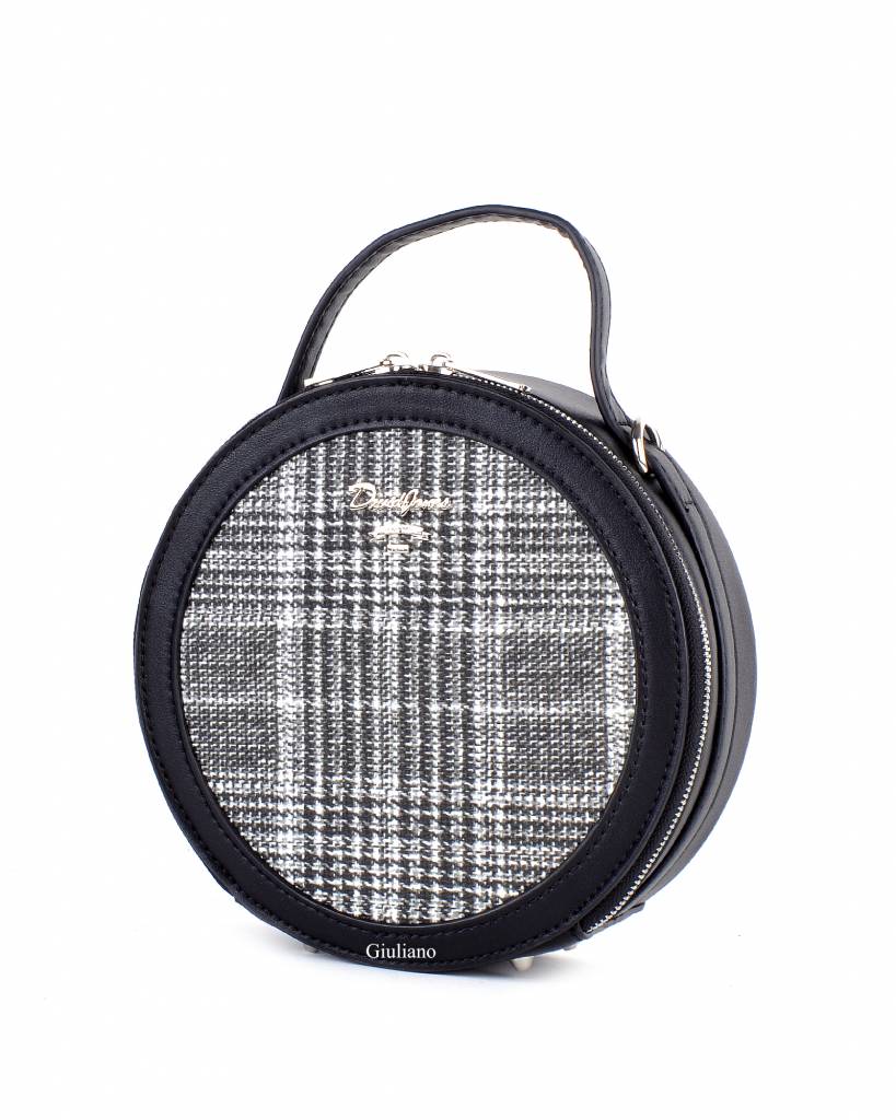 • Kunstlederen ronde handtas met kunstlederen ruit motief van David Jones. De tas sluit met een dubbele rits en heeft een afneembare, verstelbare schouderband. Op de bodem zijn metalen noppen bevestigd voor extra bescherming.
