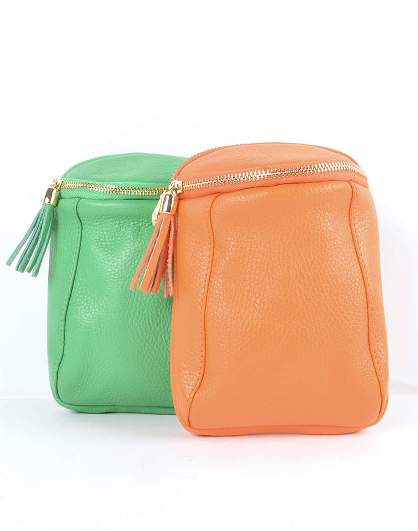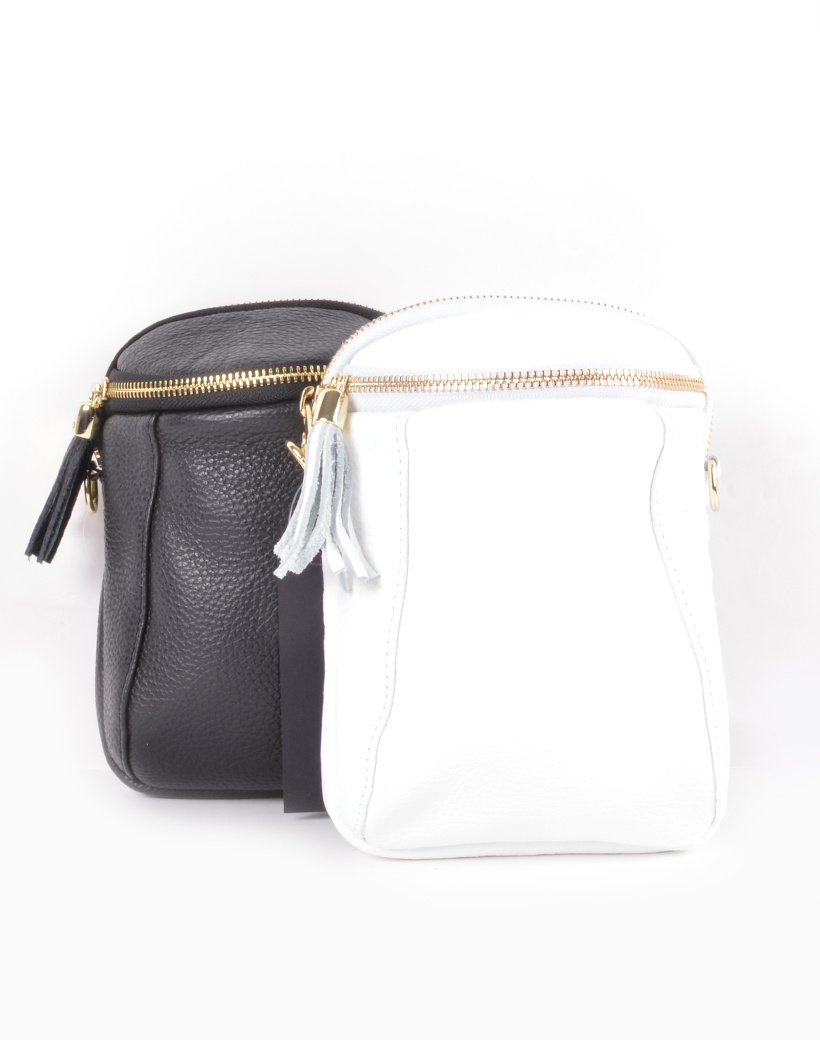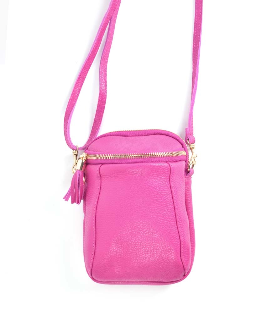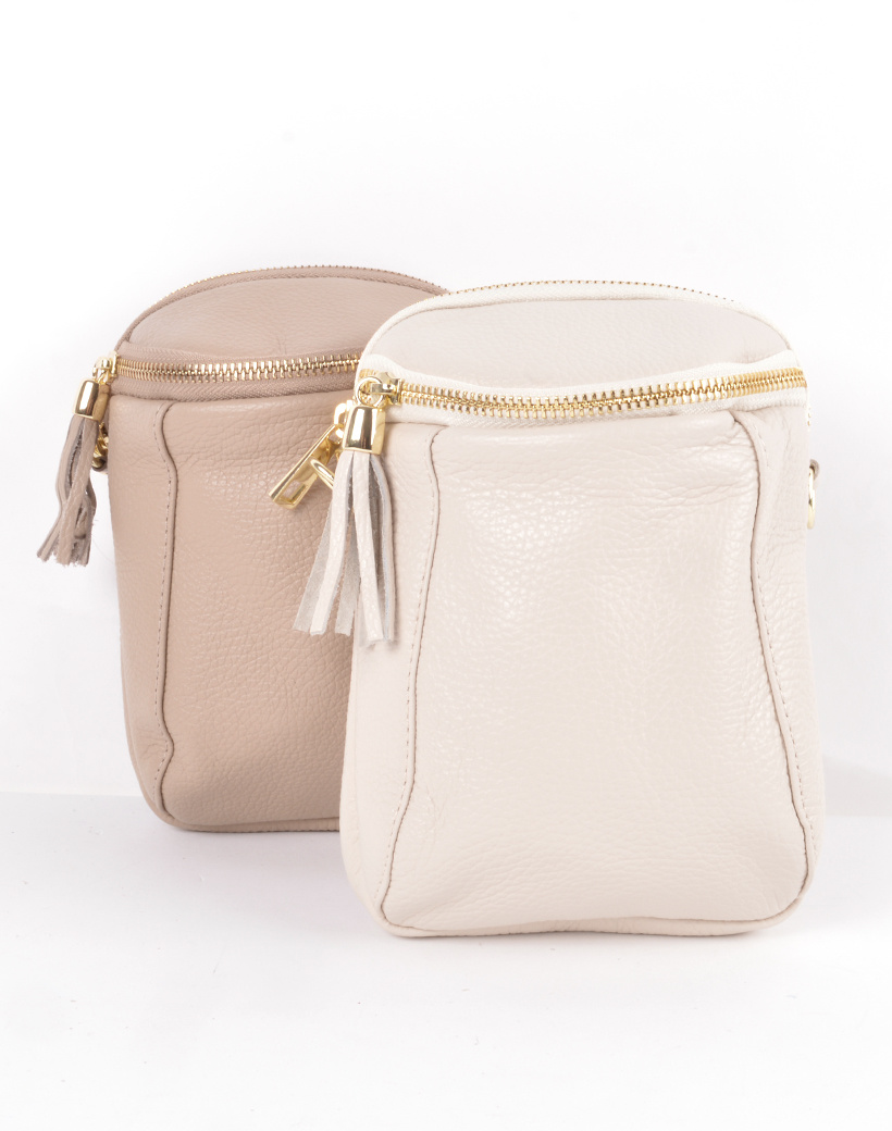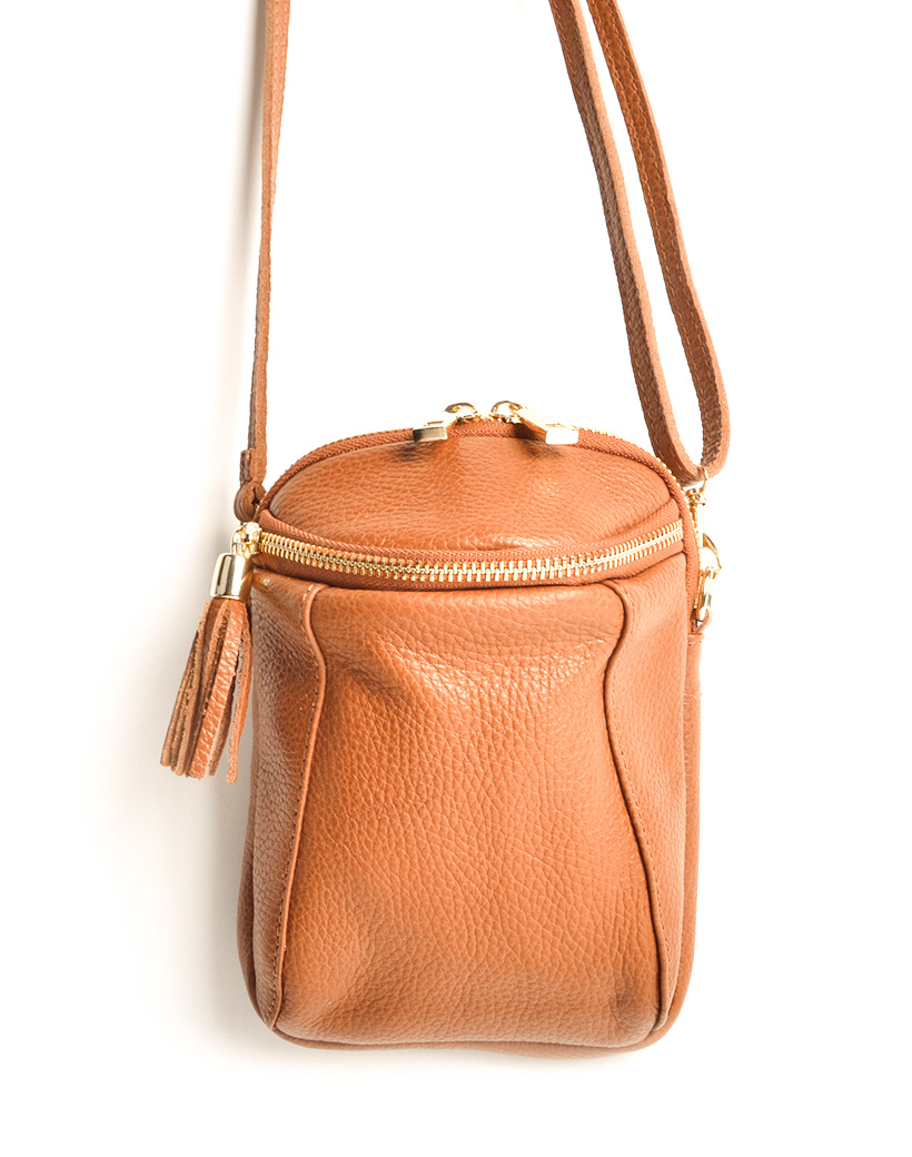 • Lederen schoudertas met 2 vakjes met een ritssluiting.