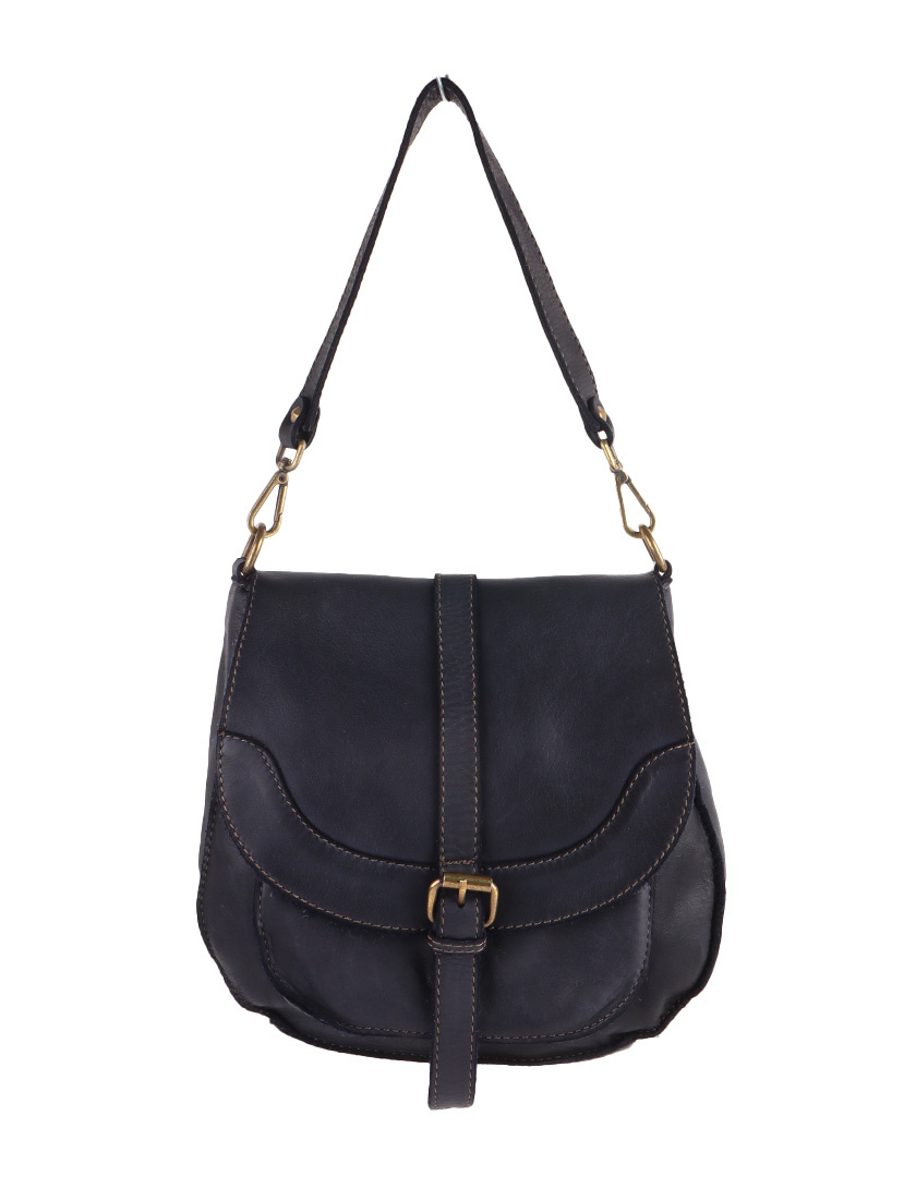 Mooie schoudertas van hoogwaardig kalfsleer, afgewerkt met bronskleurige studs en een verstelbare schouderriem. De halfronde flap sluit met een leren riempje en metalen gesp, wat zorgt voor een stijlvolle en praktische uitstraling.