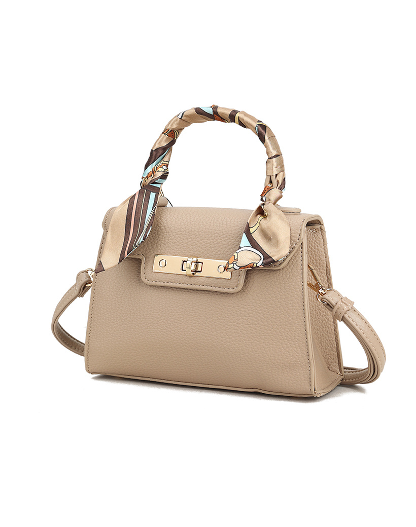 Stijlvolle olijfgroene handtas van kunstleer met satijnen sjaaldetail aan het handvat. Voorzien van draaisluiting, gevoerd hoofdvak en afneembare schouderriem. Compact, praktisch en perfect voor elke gelegenheid.