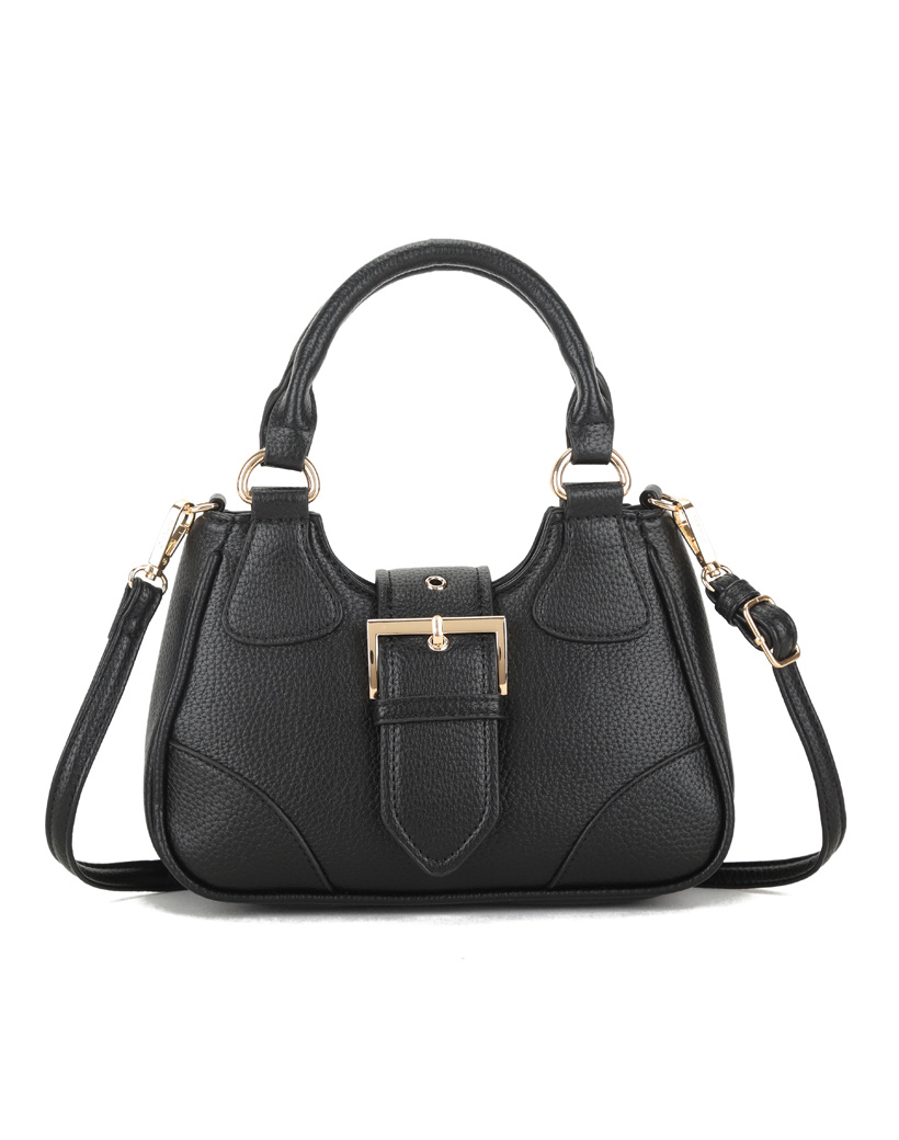 • Kunstlederen mini handtas met gesp design. Deze tas is volledig gevoerd en heeft een ritssluiting. Deze tas wordt geleverd met een afneembare en verstelbare schouderband.