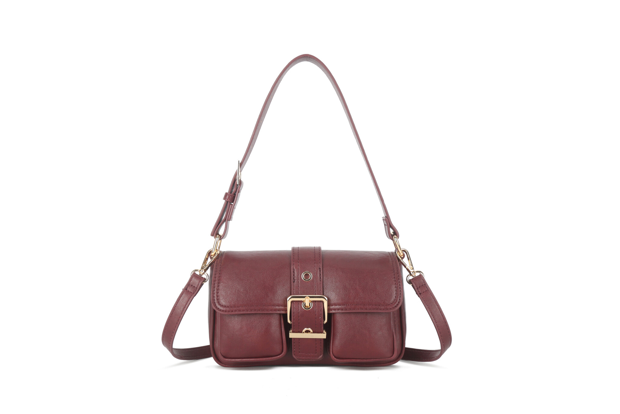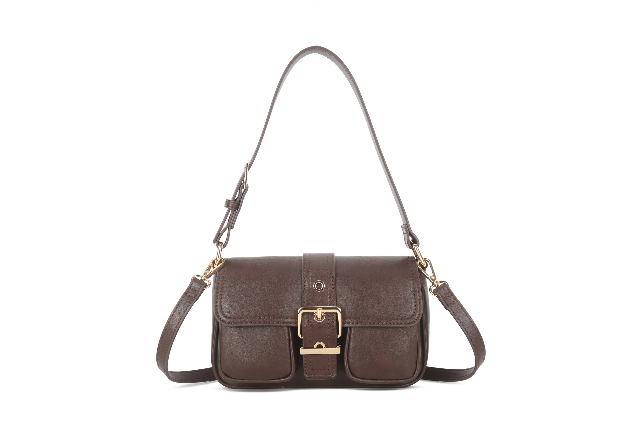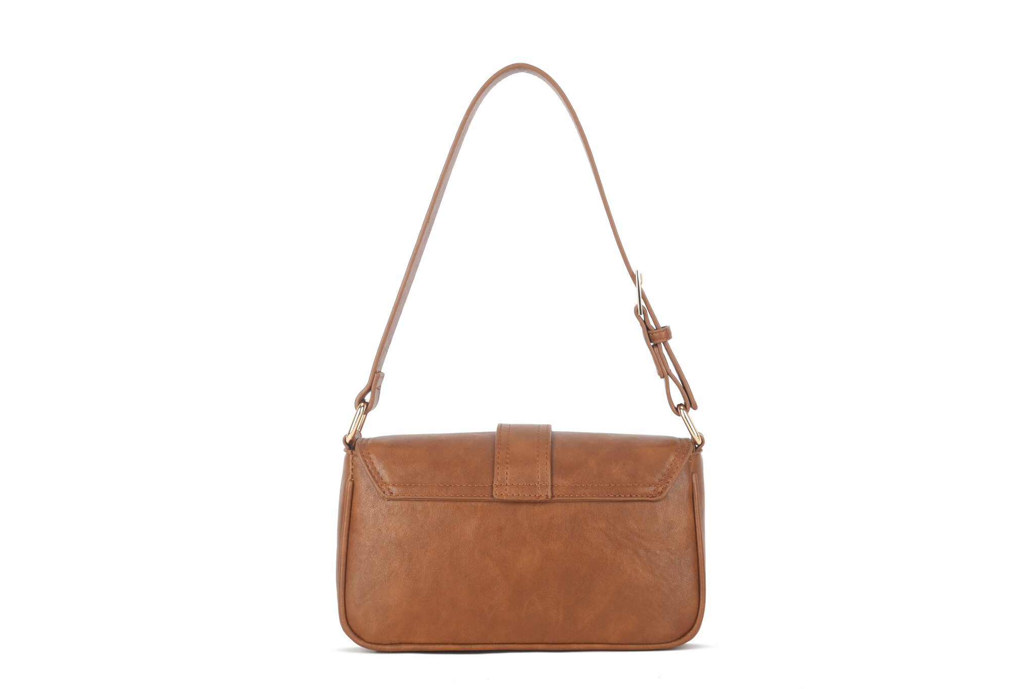 Schoudertas met retro look, denkend aan de jaren '60 & '70. De gouden gesp zorgt voor een modernere afwerking dat mooi combineert met het klassieke silhouet van de tas. Onder de gesp zit een magneetsluiting. De tas heeft 2 binnenvakken en 2 buitenvakken.