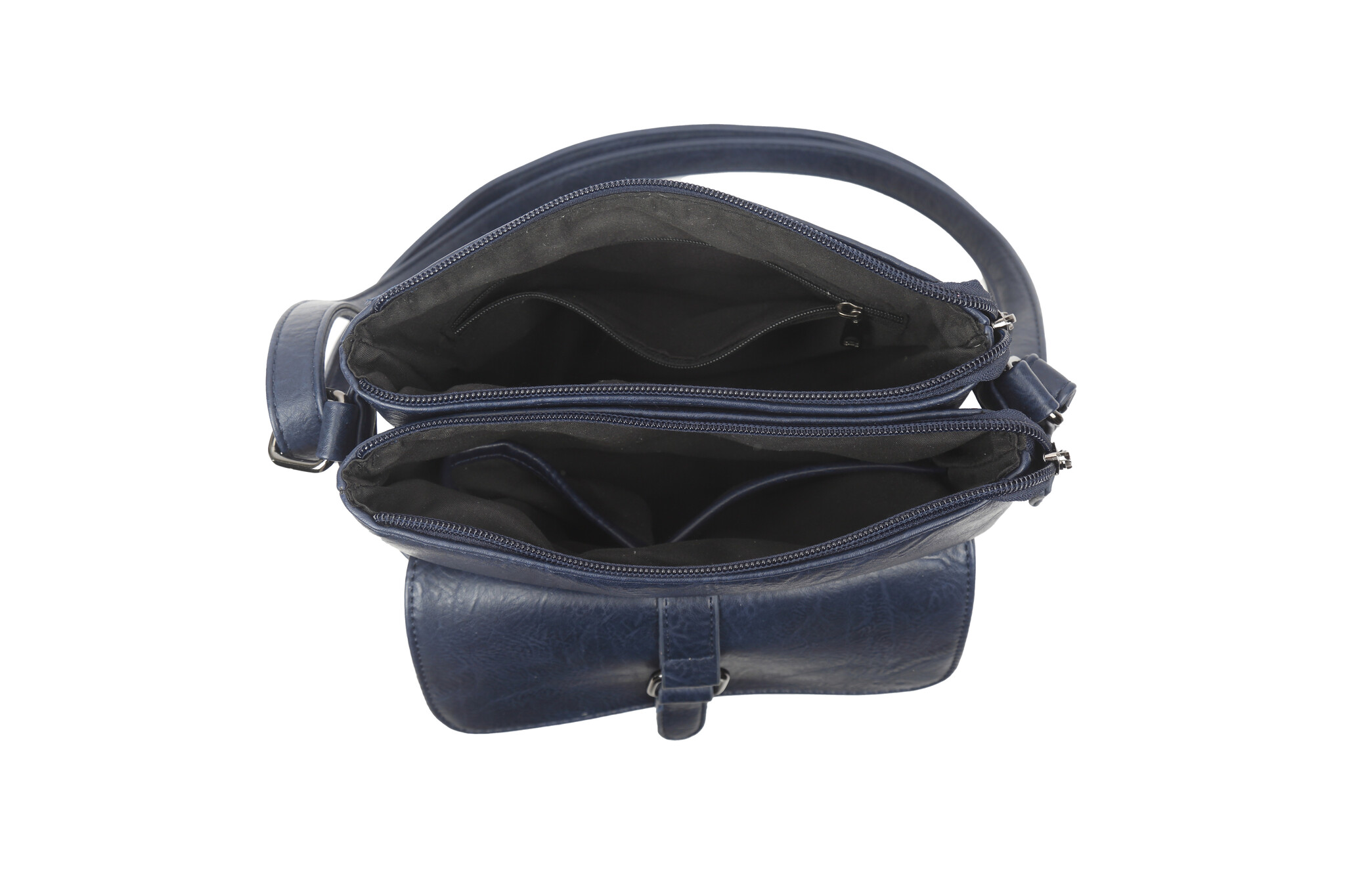 Leuke kunstlederen schoudertas met flap aan de voorkant en vak aan de achterkant. De tas bestaat uit twee hoofdvakken, elk met eigen ritssluiting. In elk hoofdvak zit een binnenvak, waarvan 1 met rits.