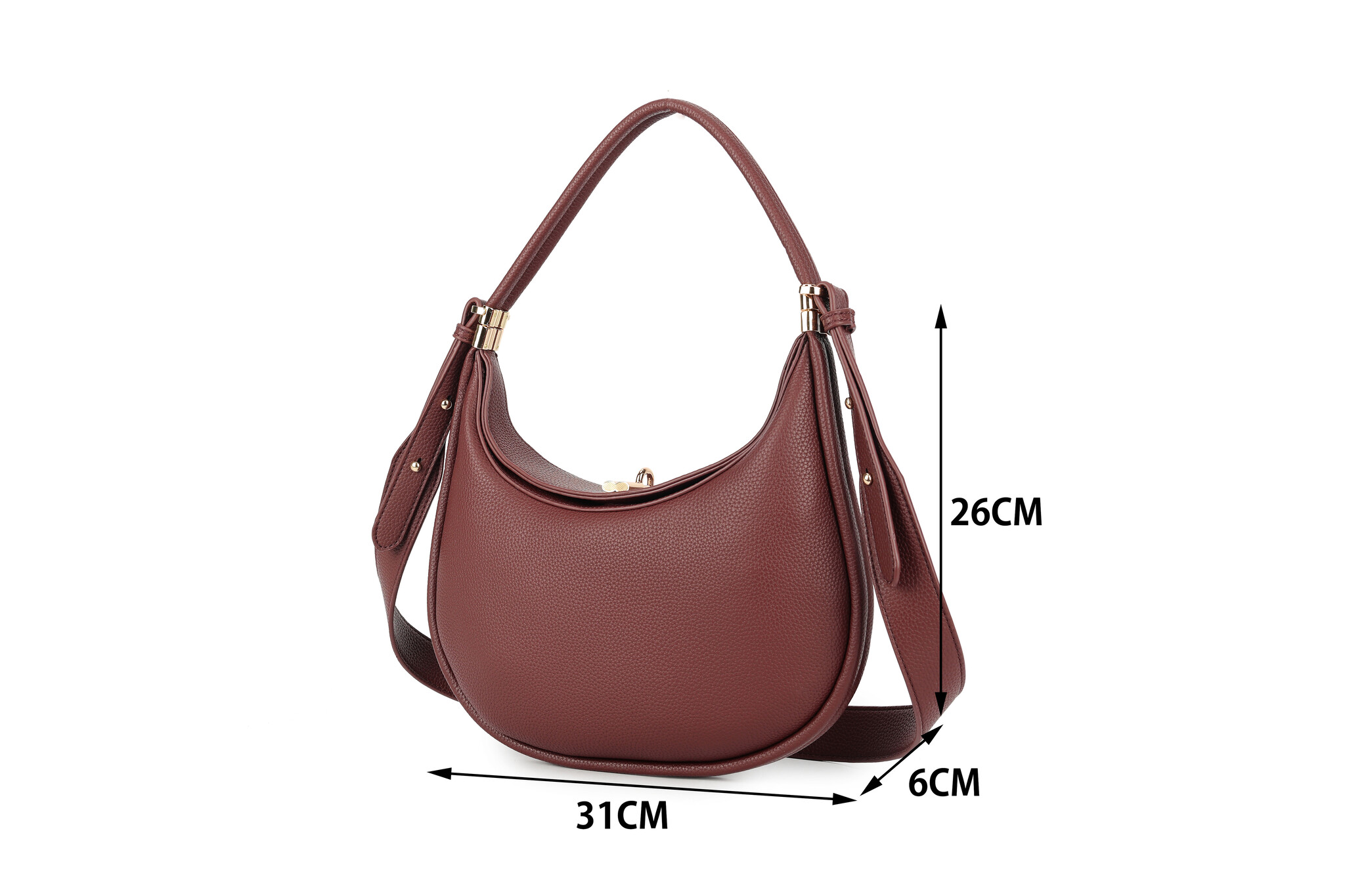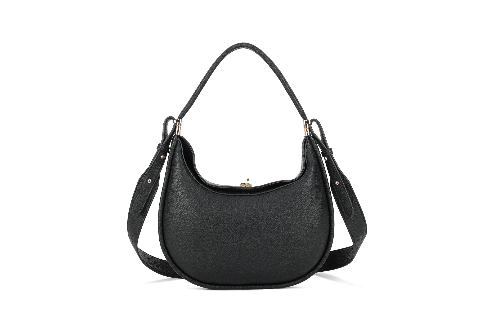 Lederen schoudertas met een gouden metalen H op de voorkant. De tas sluit met een rits en over de bovenkant loopt een stuk leer dat aan de achterkant sluit met een drukknop. De tas wordt geleverd met 2 banden waarvan 1 kort en 1 verstelbaar.