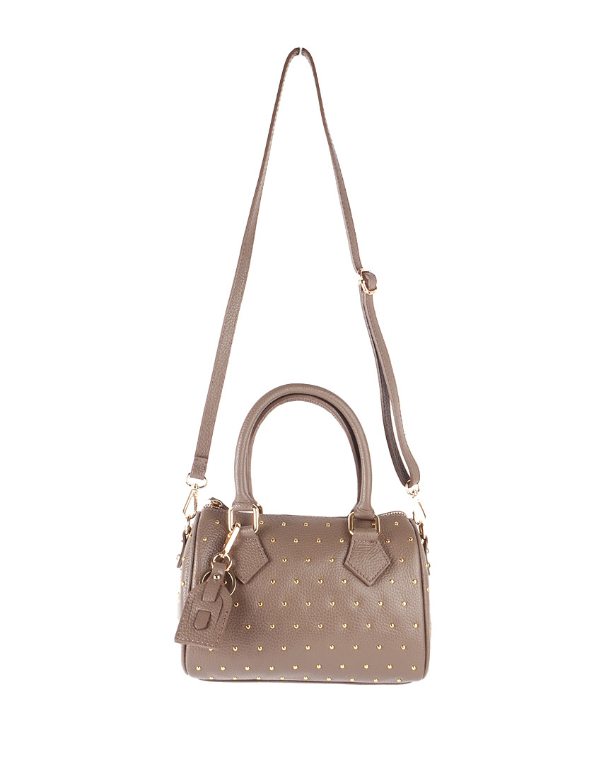 Stijlvolle handtas van leer met goudkleurige studs. Luxe uitstraling met stevige handgrepen en afneembare schouderband. Verkrijgbaar in meerdere elegante kleuren.