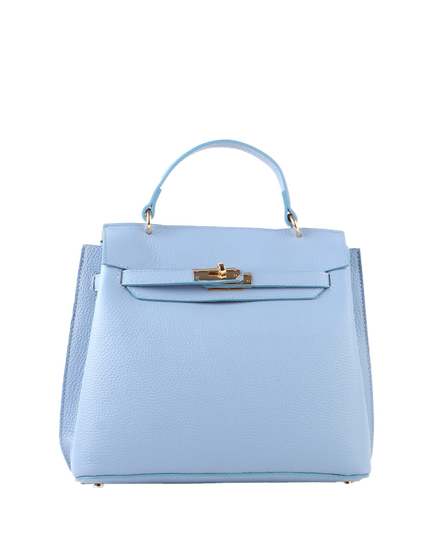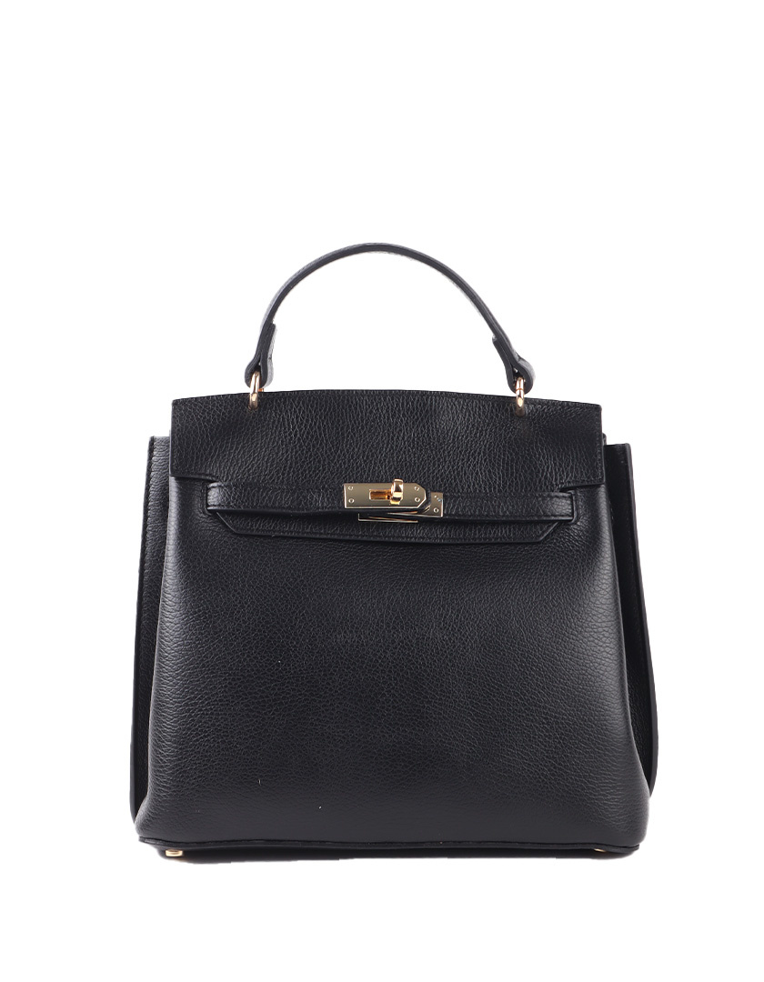 Structuurhandtas met vaste handgreep, klep met draaisluiting en zijpanelen in reliëfstructuur. Stevig recht model met beschermnoppen aan de onderzijde.