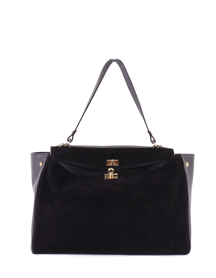• Handtas van suède met leren details voor een elegante uitstraling.