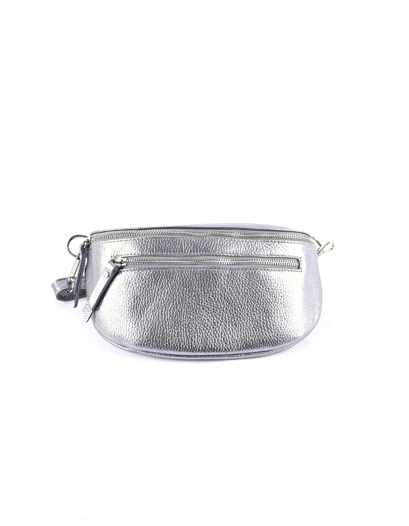 • Lederen metallic schoudertas met een ritssluiting en een voorvakje.