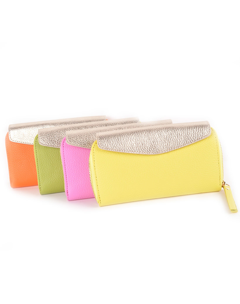 • Lederen portemonnee van grof leer. De portemonnee sluit met een rits, en heeft meerdere vakjes aan de binnenzijde. De portemonnee heeft een metallic kleurig flapje met knop.