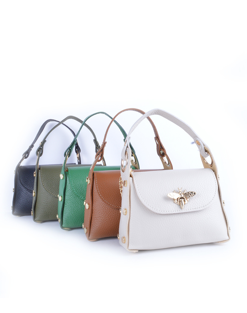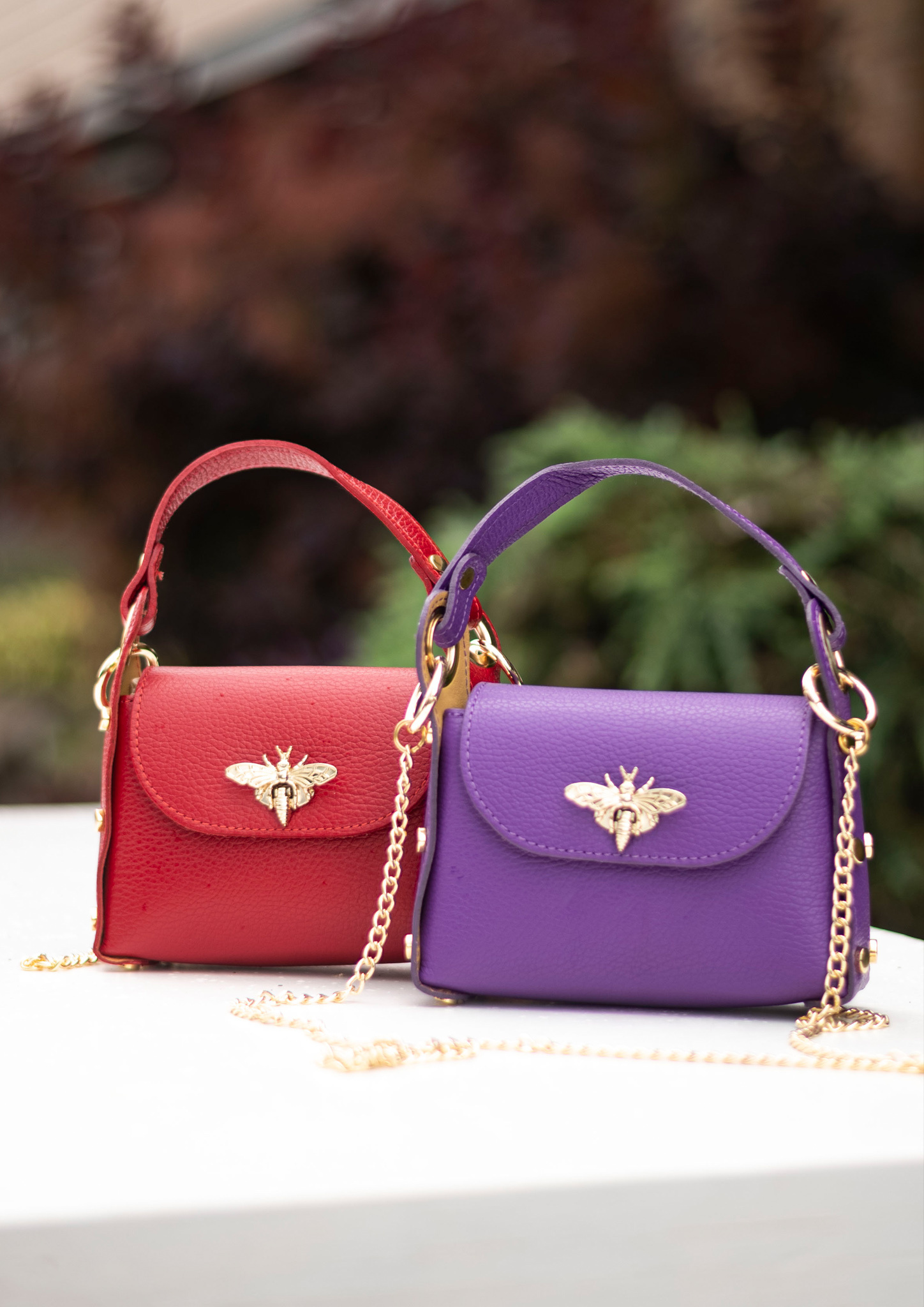 • Lederen schoudertas met een wesp detail/sluiting. Deze tas heeft een metalen ketting als schouderband