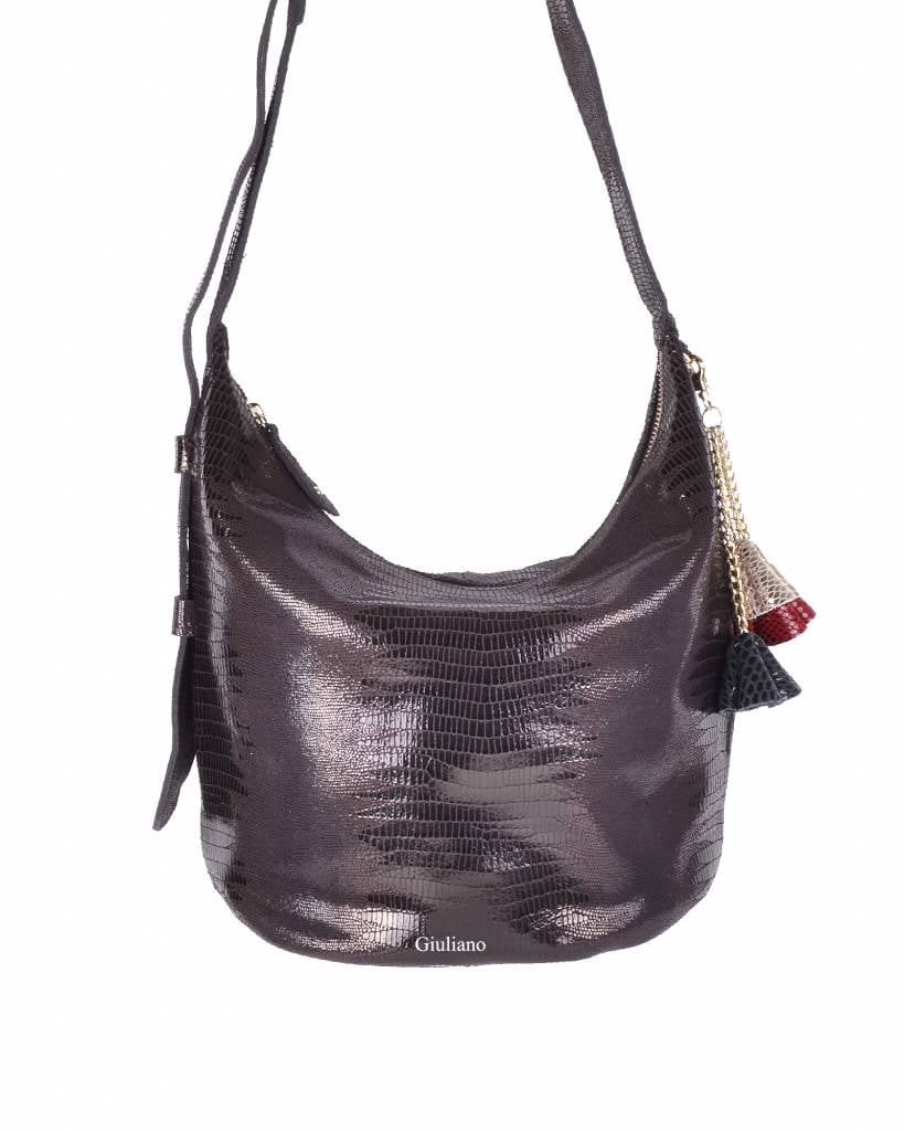 Mooie lederen handtas met glimmende coating met reliëf. De tas sluit met een rits, en heeft nog een extra vakje met rits aan de binnen en achterzijde. Het handvat is verstelbaar waardoor deze ook als schoudertas gedragen kan worden.