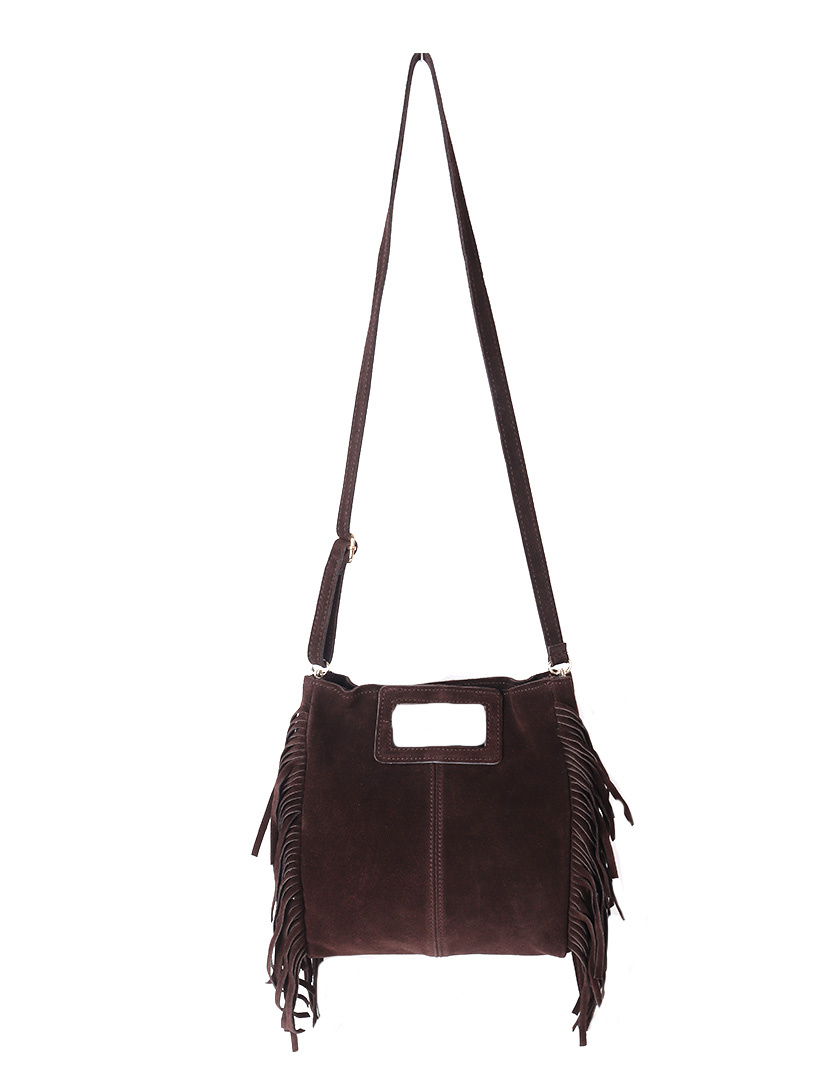 • Stijlvolle schoudertas van suède met speelse franjes en verstelbare schouderband. Voorzien van handgreep en ritssluiting. Perfect voor dagelijks gebruik.