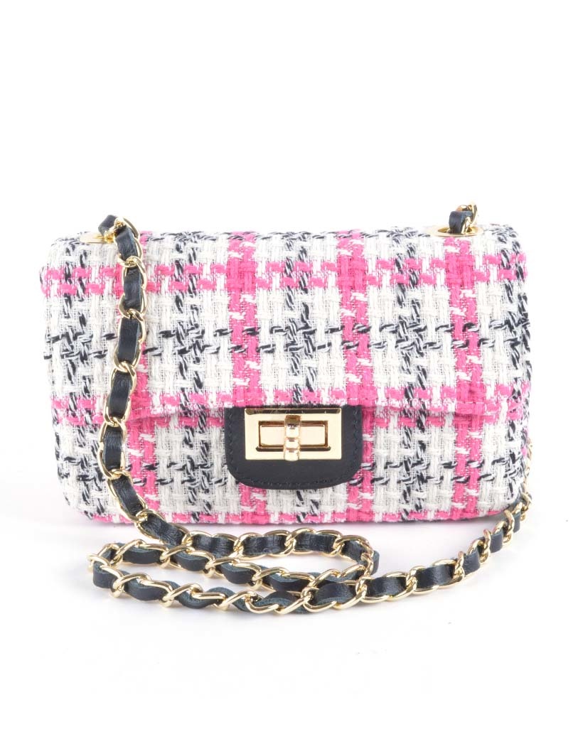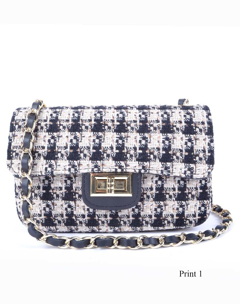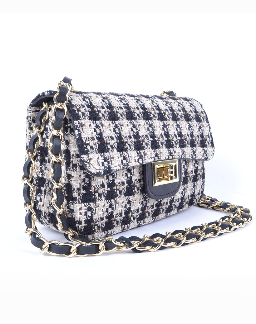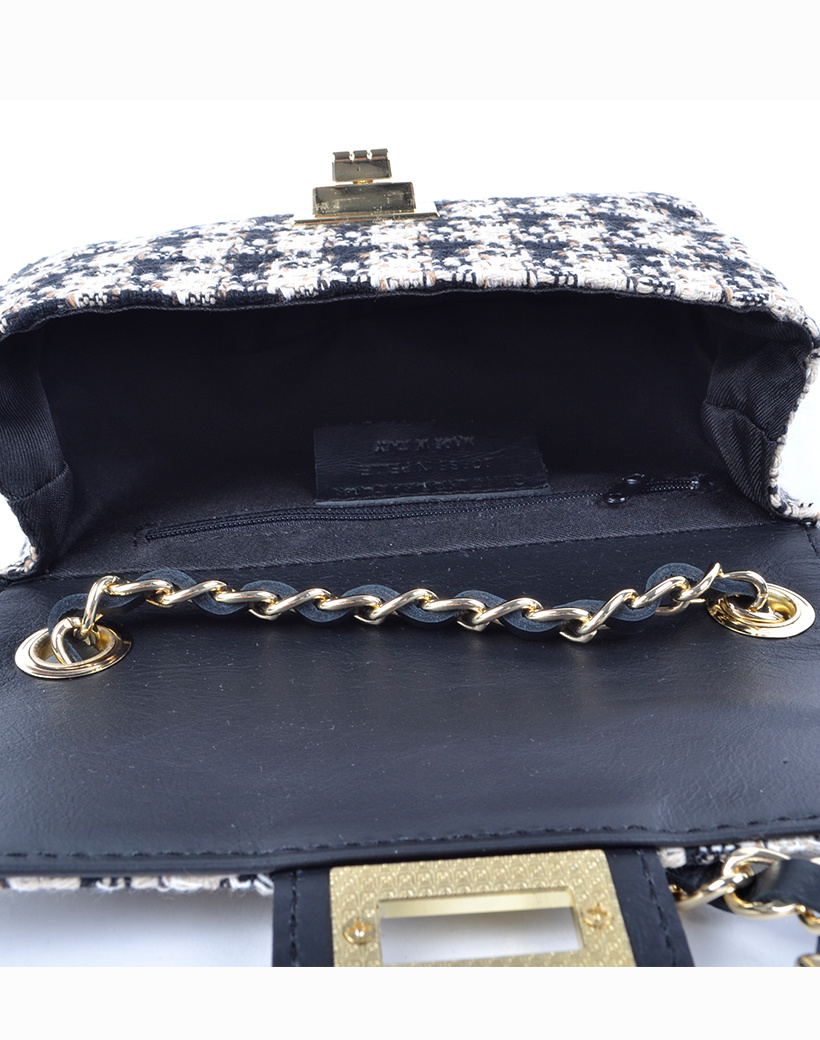 • Luxe lederen schoudertasje met stof en een lederen/ketting schouderband . De tas heeft een draaisluiting.