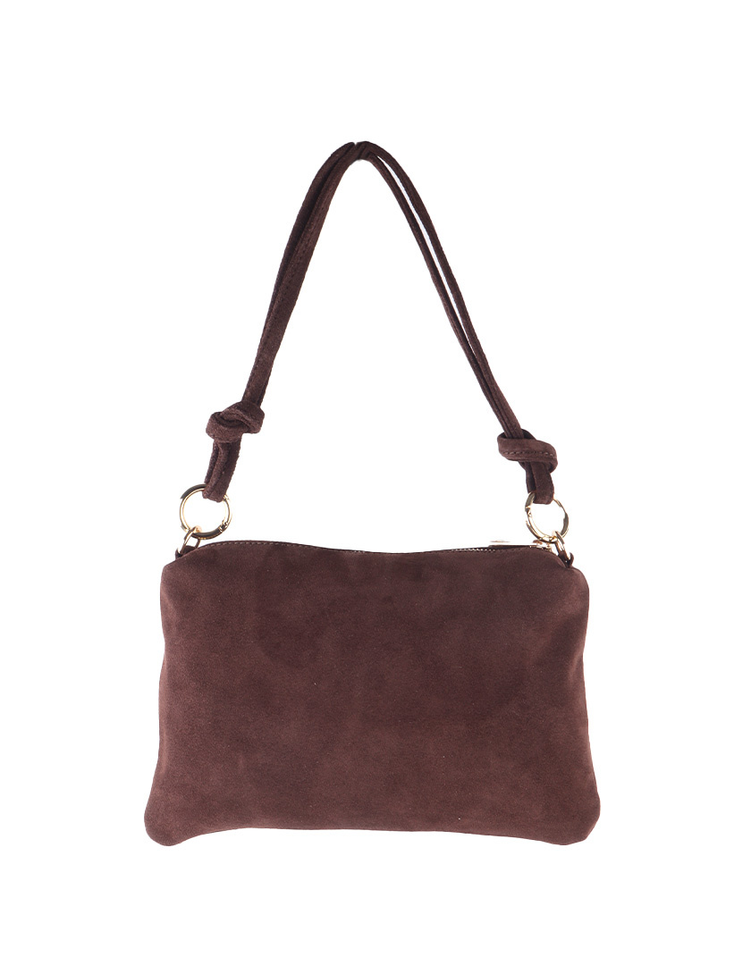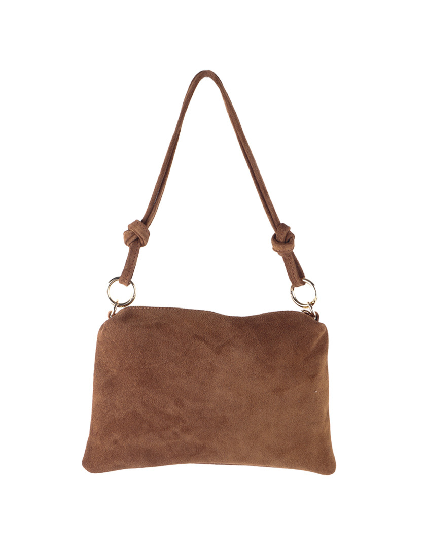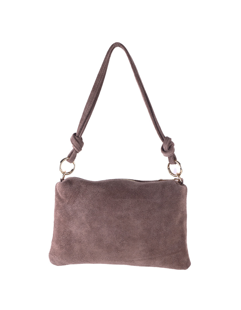 Elegante suède schoudertas met zachte, minimalistische uitstraling. Voorzien van dubbele knoopdetails aan de hengsels en een ruim hoofdvak. Perfect te combineren met zowel casual als chique outfits voor een tijdloze look.
