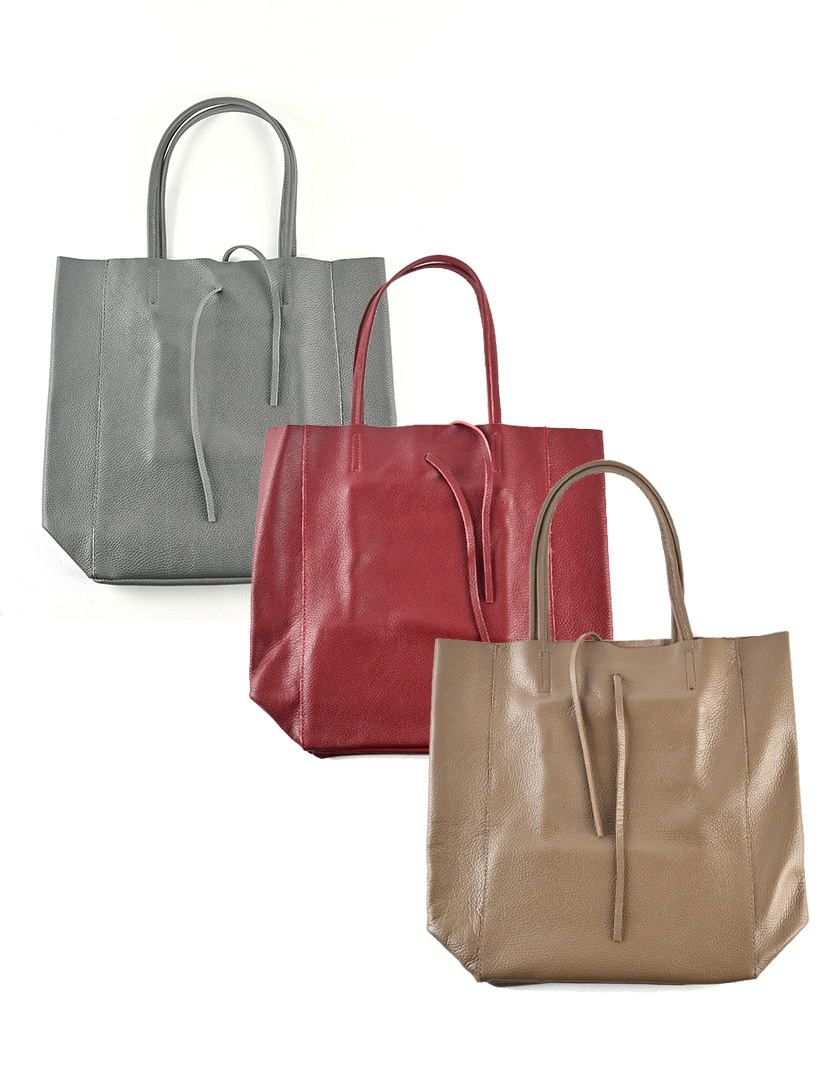 • Lederen handtas/shopper van grof leer. De tas heeft koordjes als sluiting.