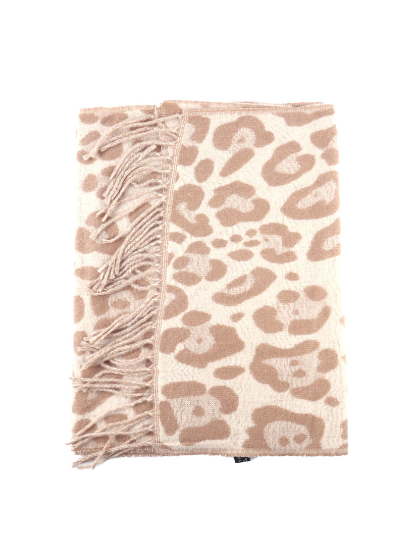 Zachte sjaal met een opvallende zwart-crèmekleurige luipaardprint. Gemaakt van hoogwaardig materiaal voor warmte en comfort, afgewerkt met fijne franjes voor een stijlvolle, moderne look.