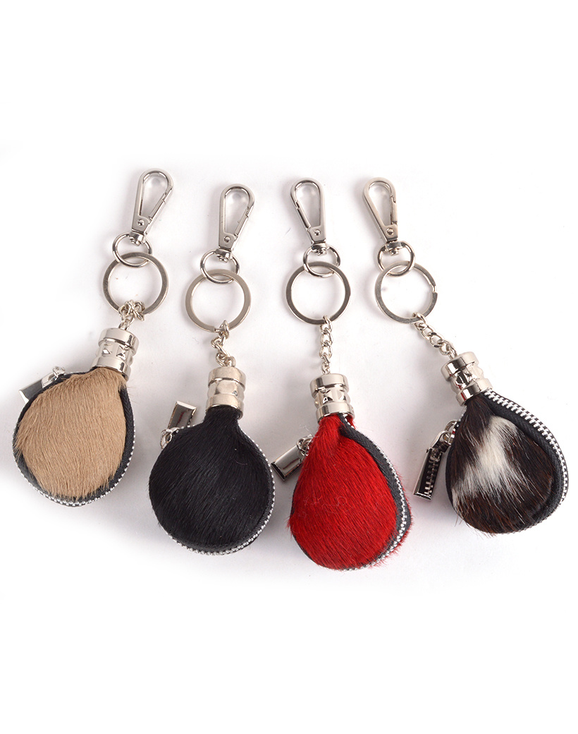 • Druppelvormige sleutelhanger met koeienvacht op de voorzijde en achterzijde. Rondom is deze afgewerkt met een rits, zodat er losse muntjes in bewaard kunnen worden.