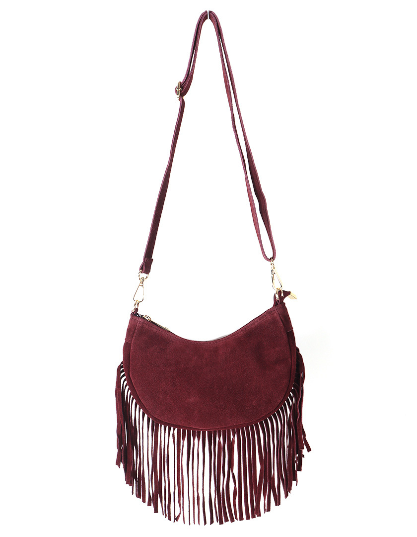 • Leder suède schoudertas met franjes. De tas heeft een verstelbare en afneembare schouderband.