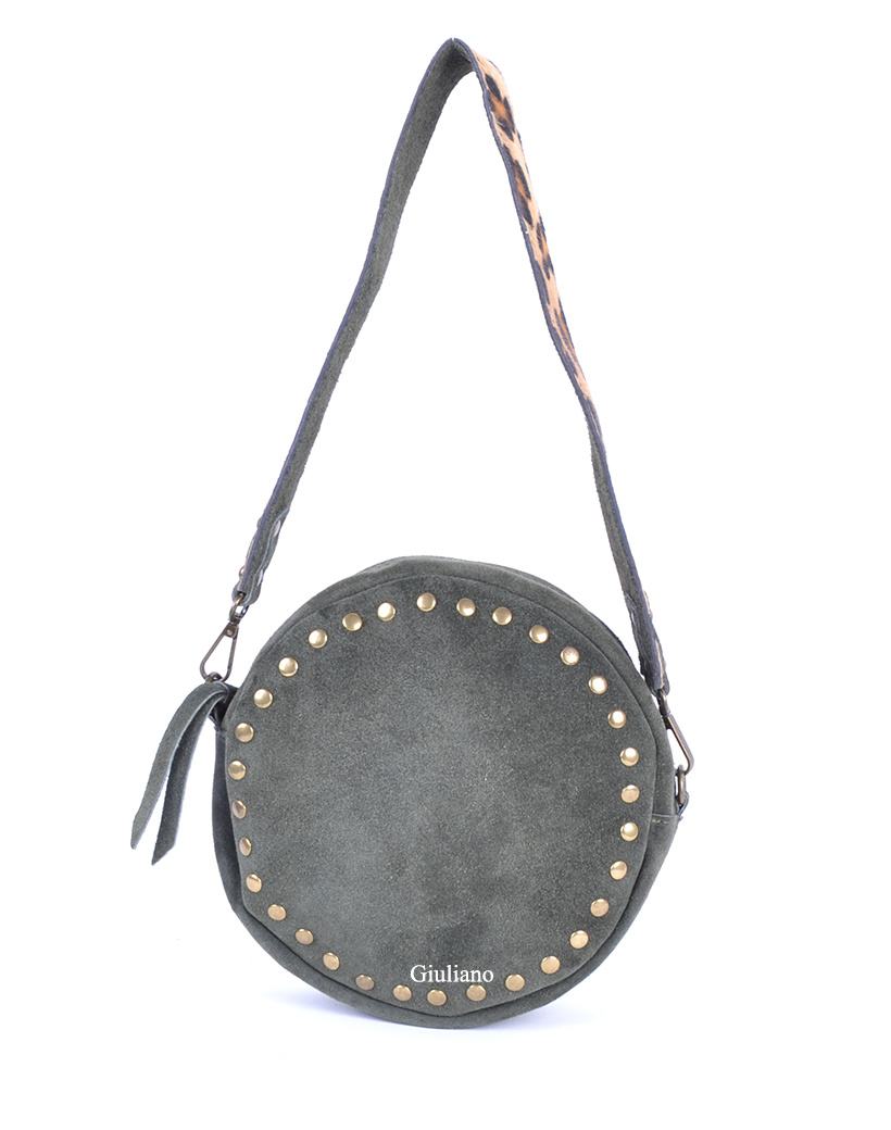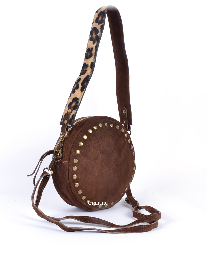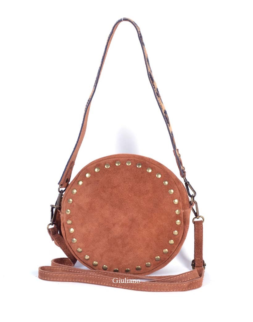 • Ronde suede schoudertasje met studs. Het tasje wordt geleverd met een brede schouderband gemaakt met echte koeienvacht en een extra lange schouderband,