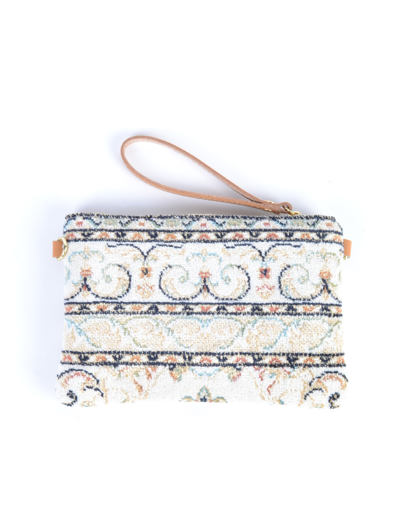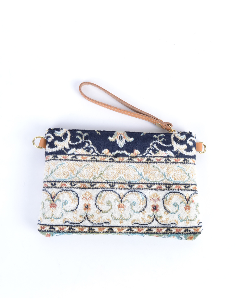 • Tapijt schoudertasje/clutch met lederen polsbandje en lange schouderband. De lange schouderband is afneembaar en verstelbaar.