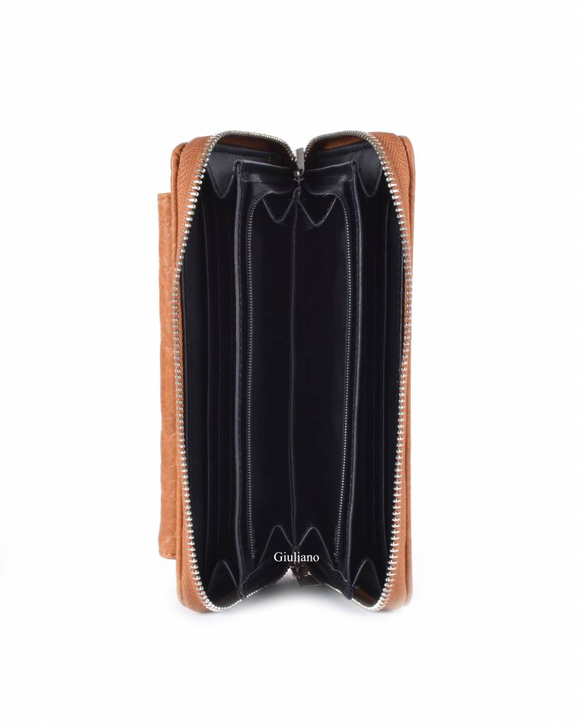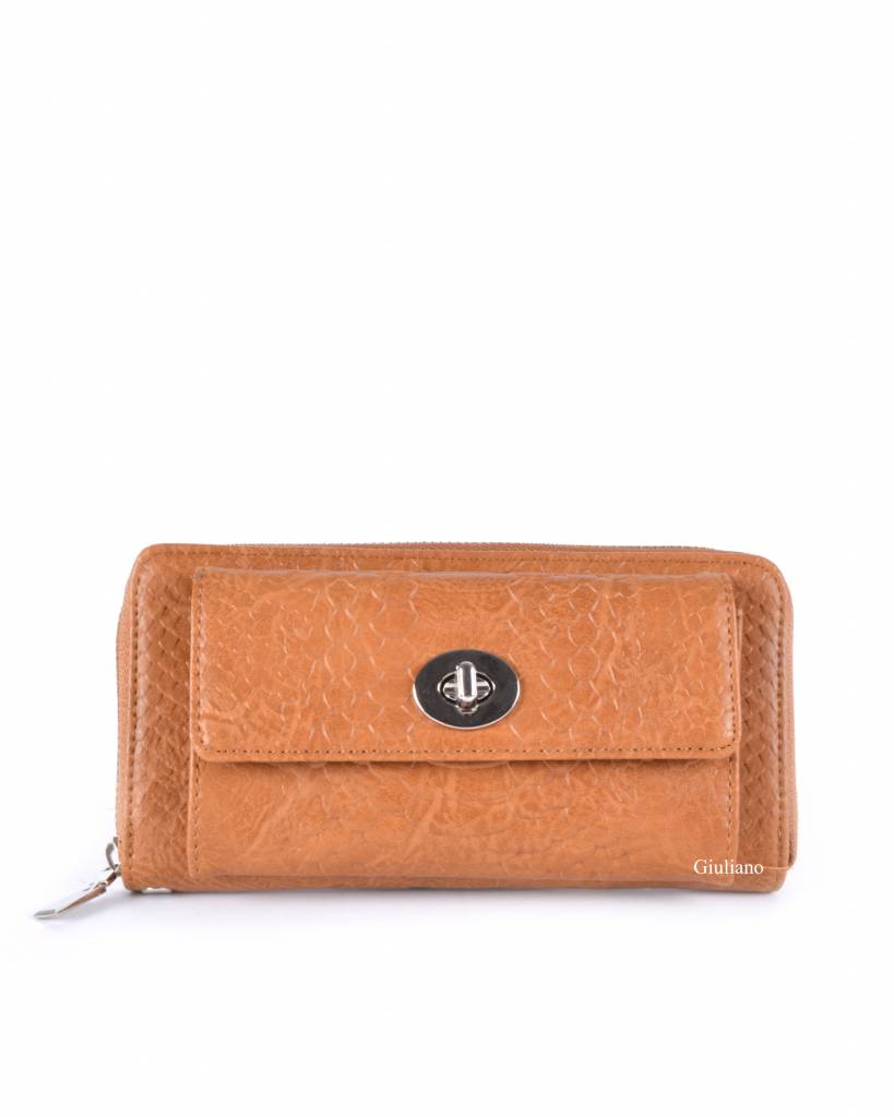 • Artificial leather wallet with croco pattern. The wallet has a front pocket with twist closure, and the main compartment closes with a zipper. A detachable wristband is included.