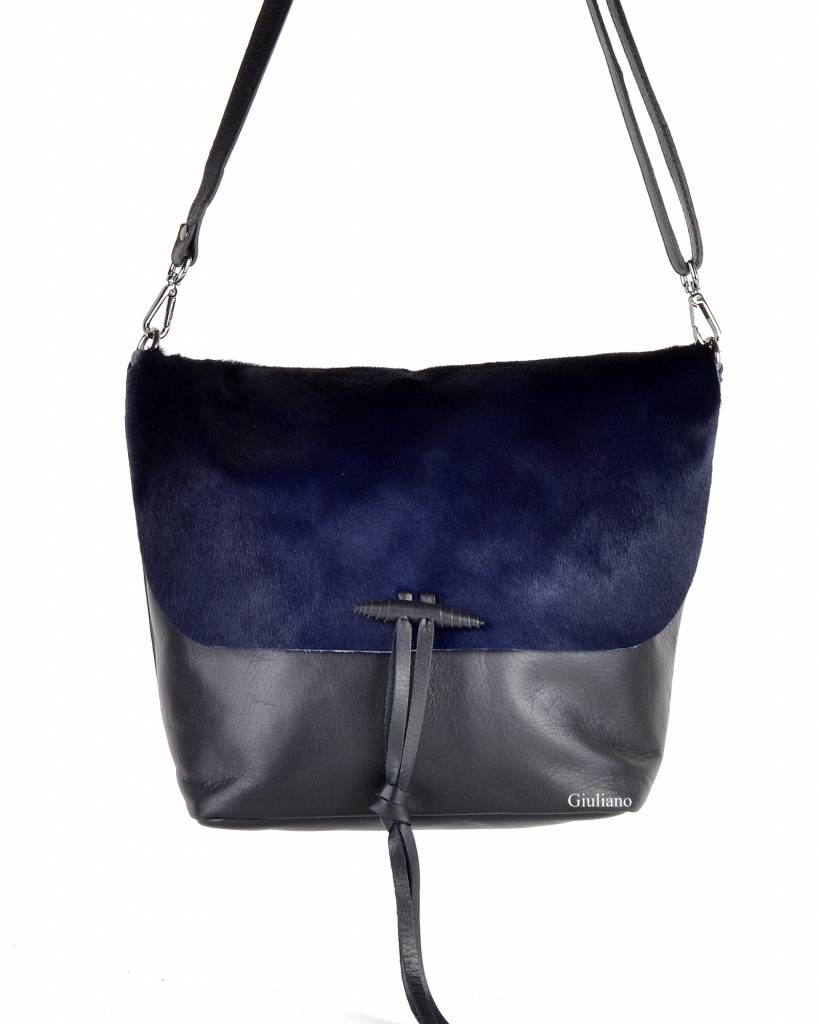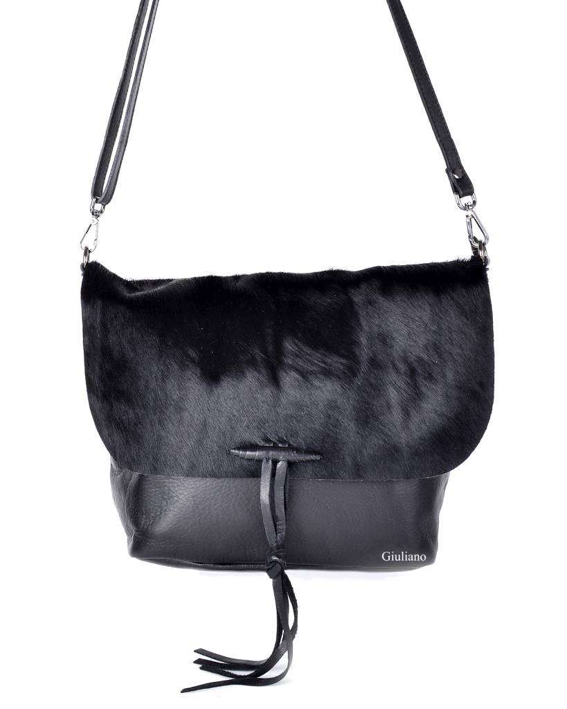 Leather shoulder bag with a cowhide flap. The bag closes with a zipper and has an extra compartment with zipper on the back. The shoulder strap is adjustable.