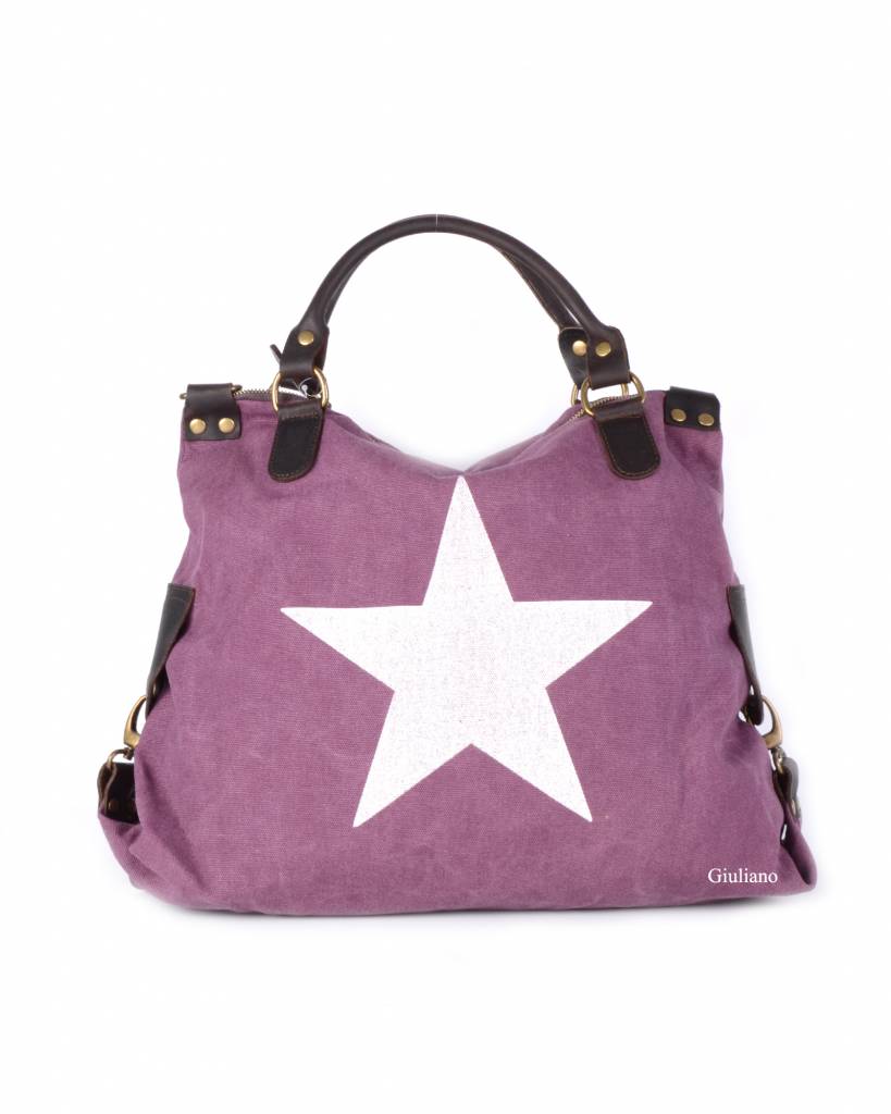 • Canvas bag with leather handles and printed with a star on the front. The bag closes with a zipper and has a detachable and adjustable shoulder strap.