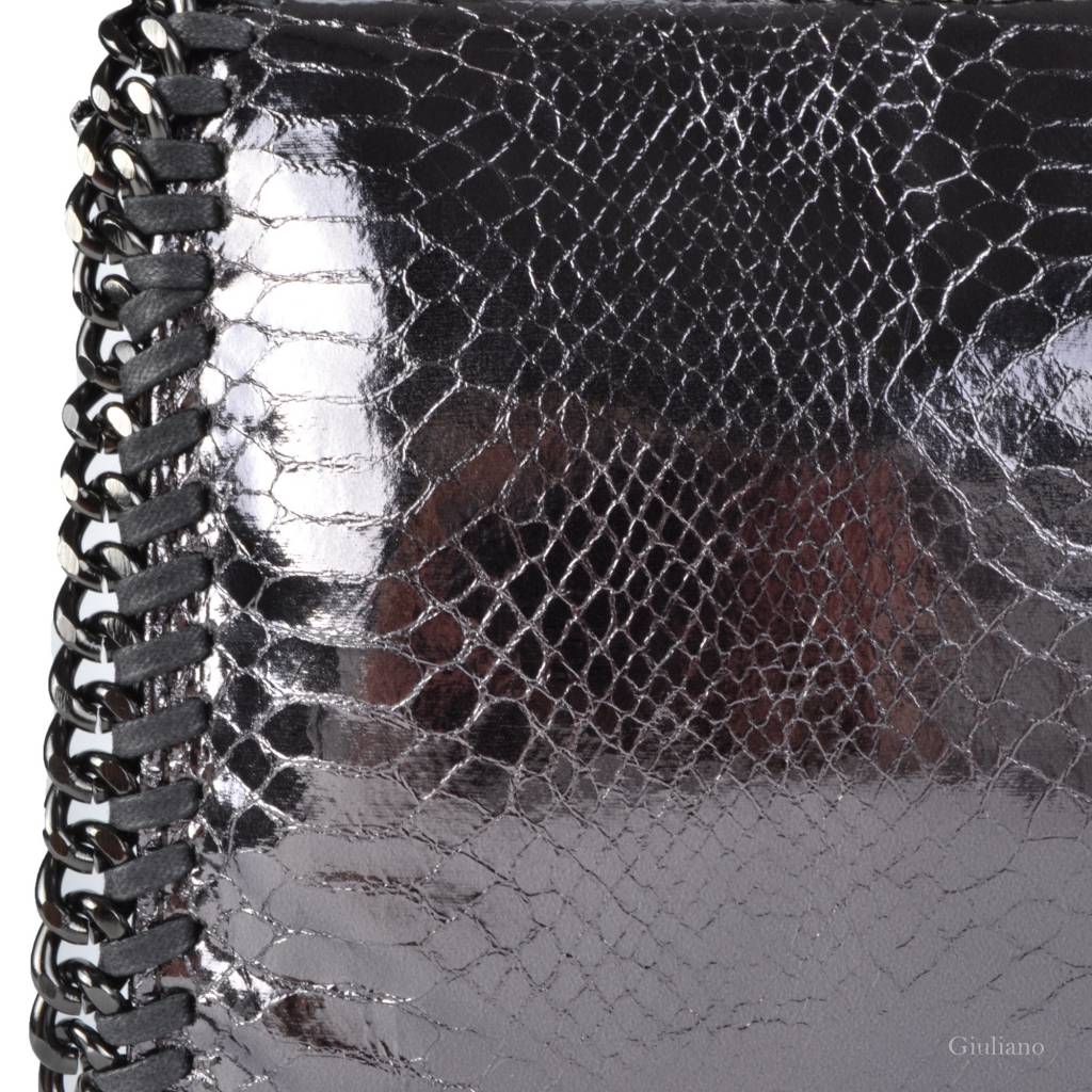 Artificial leather handbag with chain and metallic coating. The bag closes with a zipper, and has a detachable shoulder strap of only artificial leather. With metallic coating and finished with a chain. The bag is available in 3 sizes; small, medium and l
