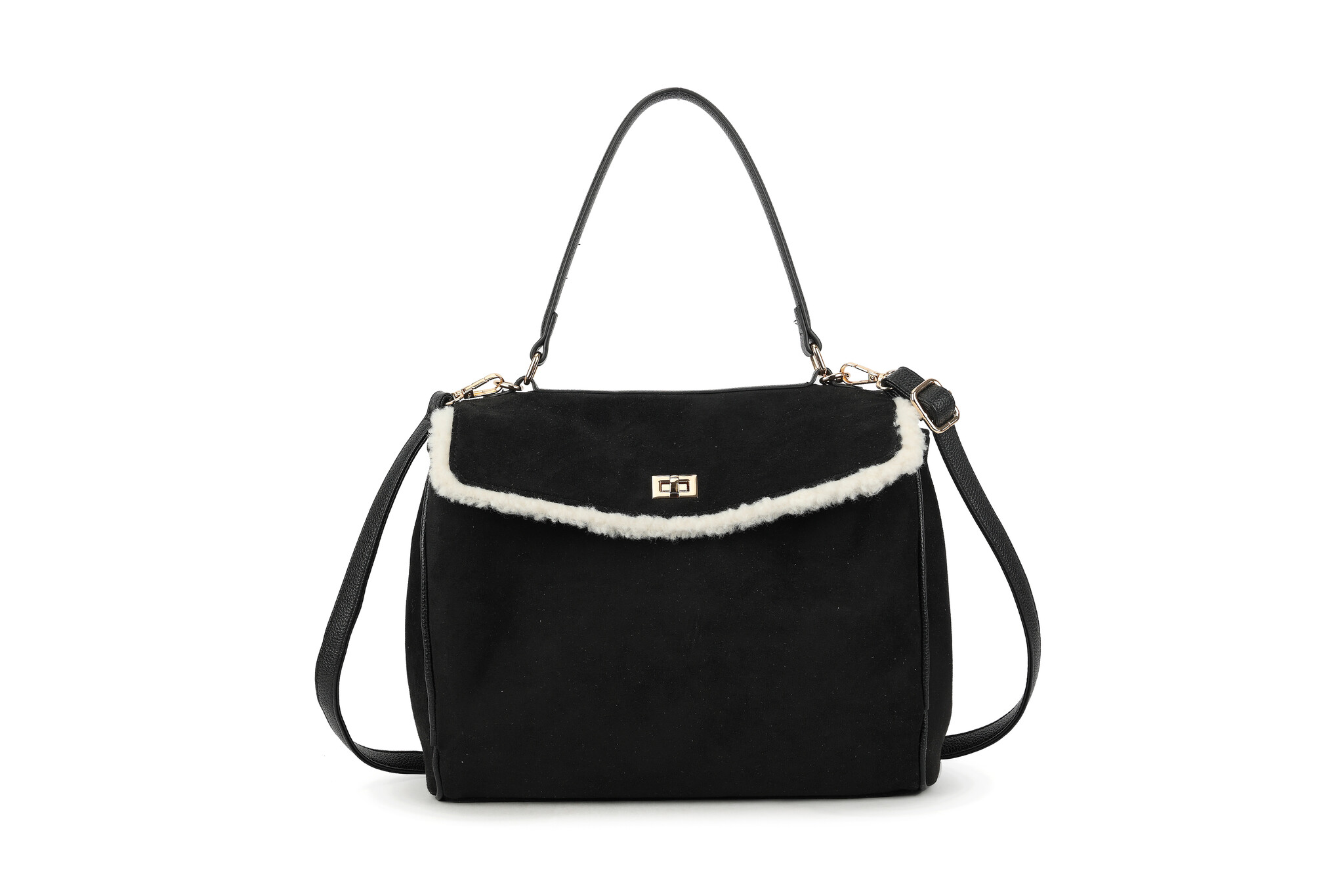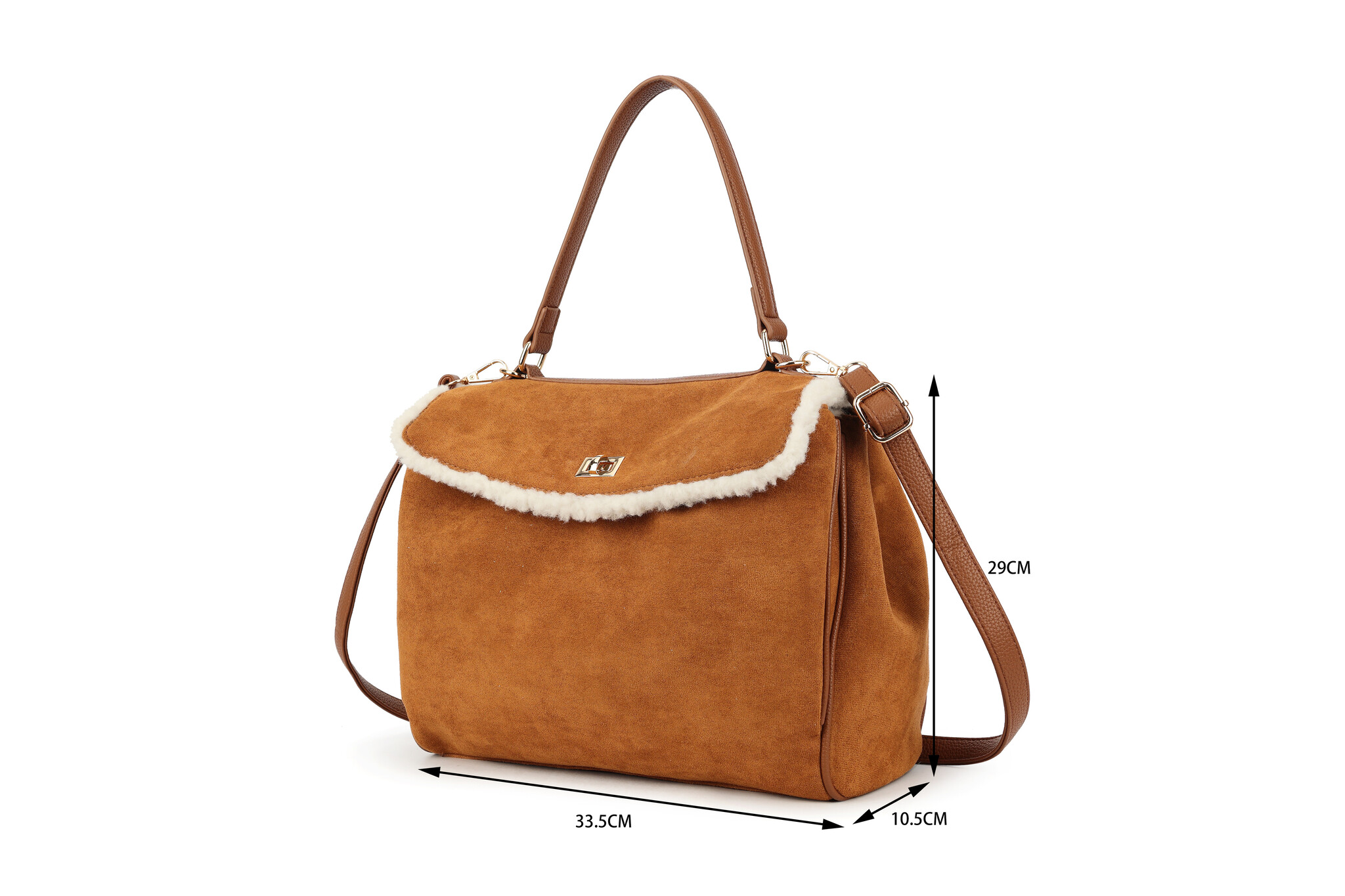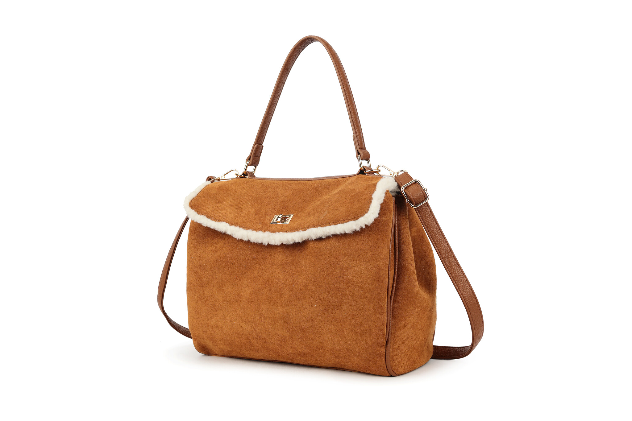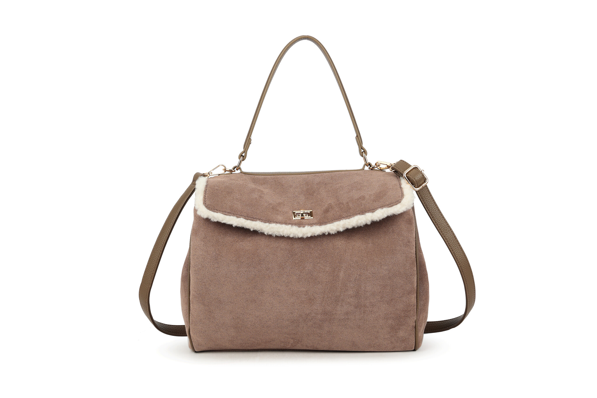 Stylish winter bag with soft suede look and white fur flap. Features handle, adjustable shoulder strap and convenient interior pockets. Perfect for any winter outfit.