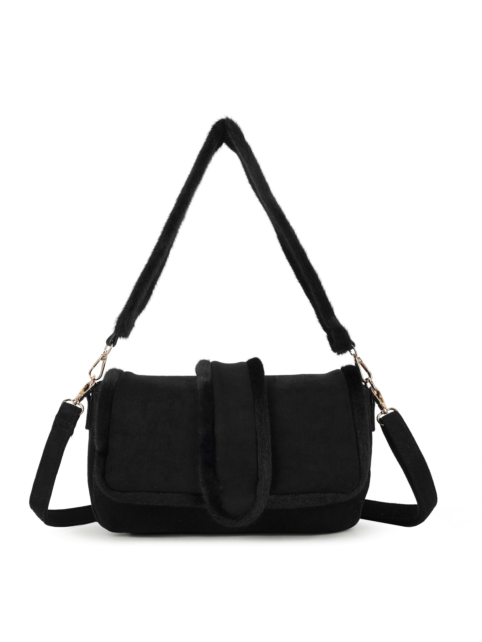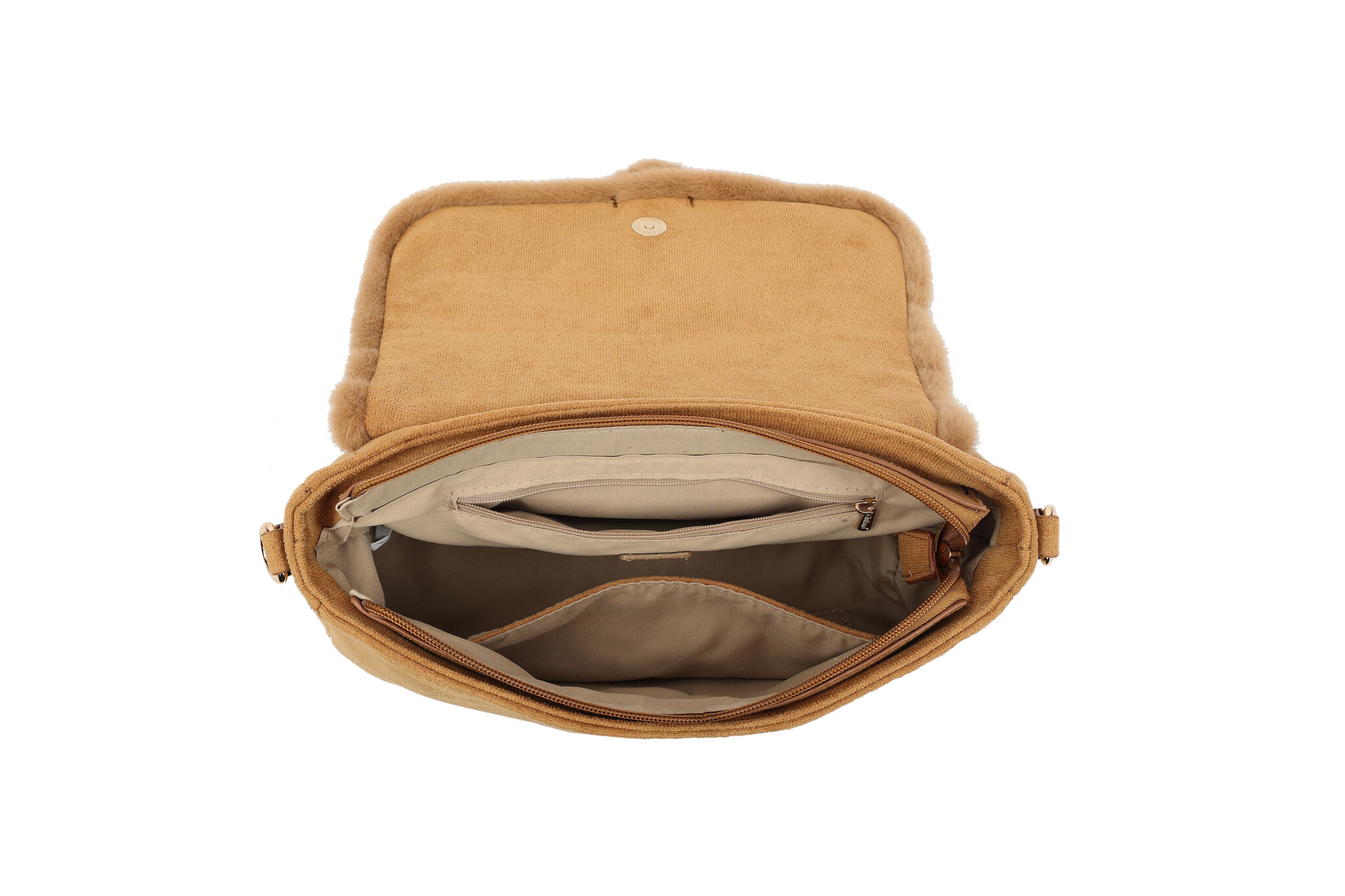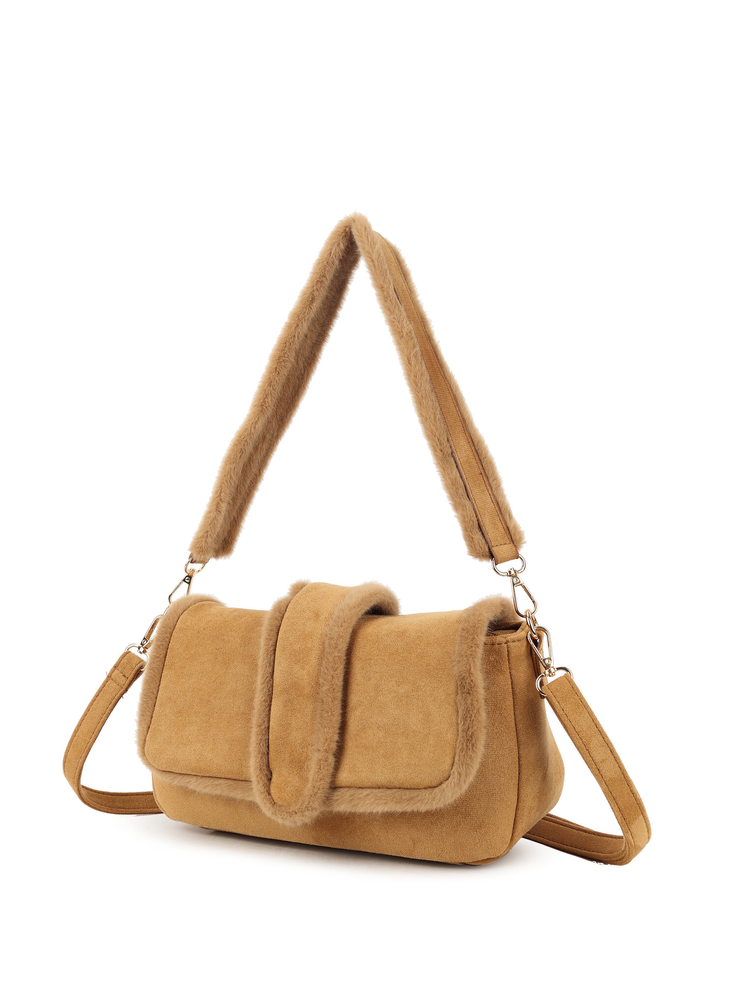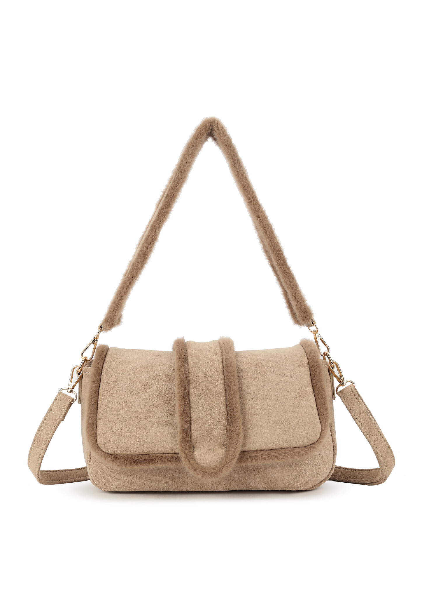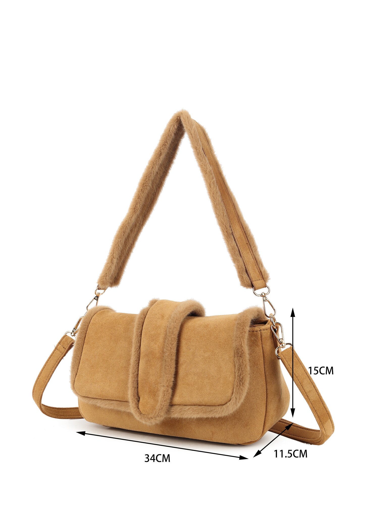 • Soft shoulder bag with teddy trim and elegant chain detail. Features adjustable strap and multiple pockets. Ideal for everyday use or a cozy winter look. Available in warm colors.