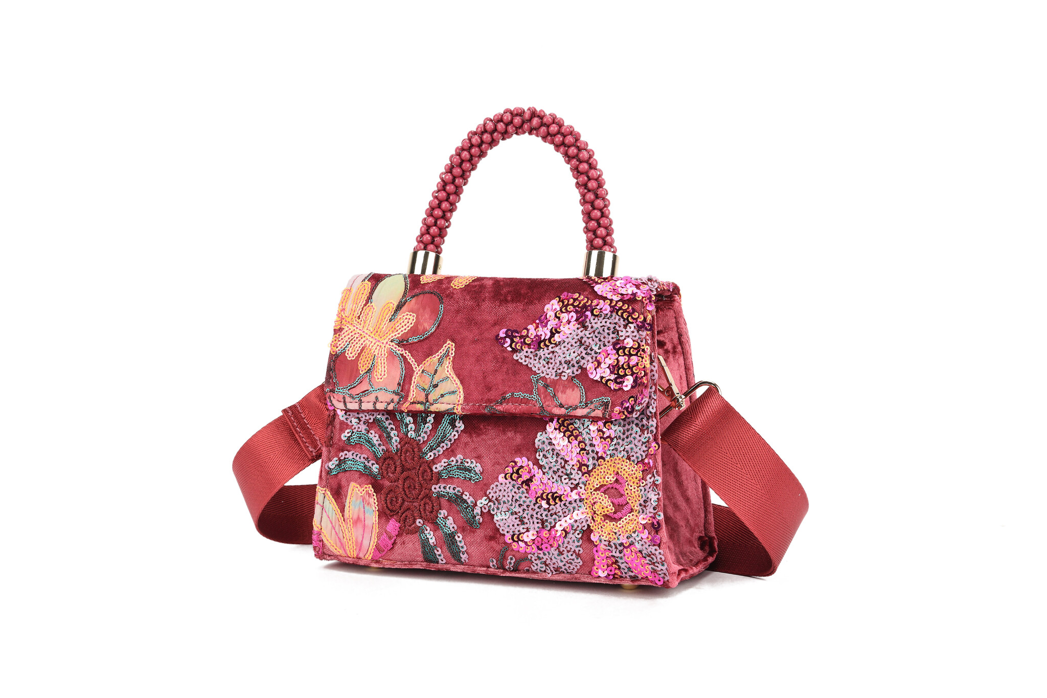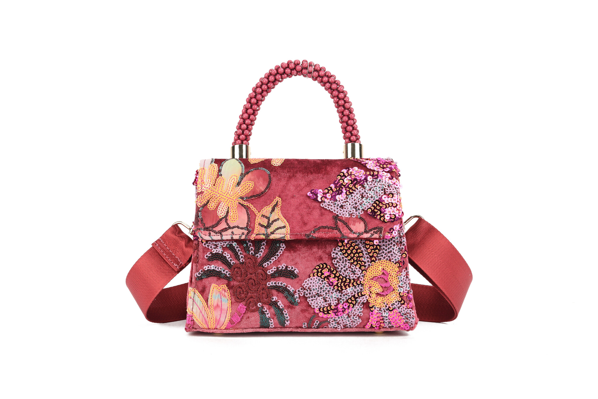 • Faux leather sequin handbag with a flower print. The bag has a bagstrap.