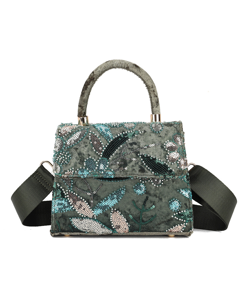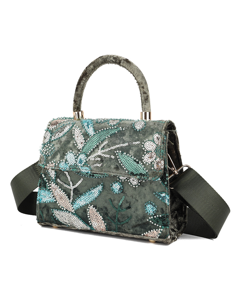 • Faux leather sequin handbag with a flower print. The bag has a bagstrap.