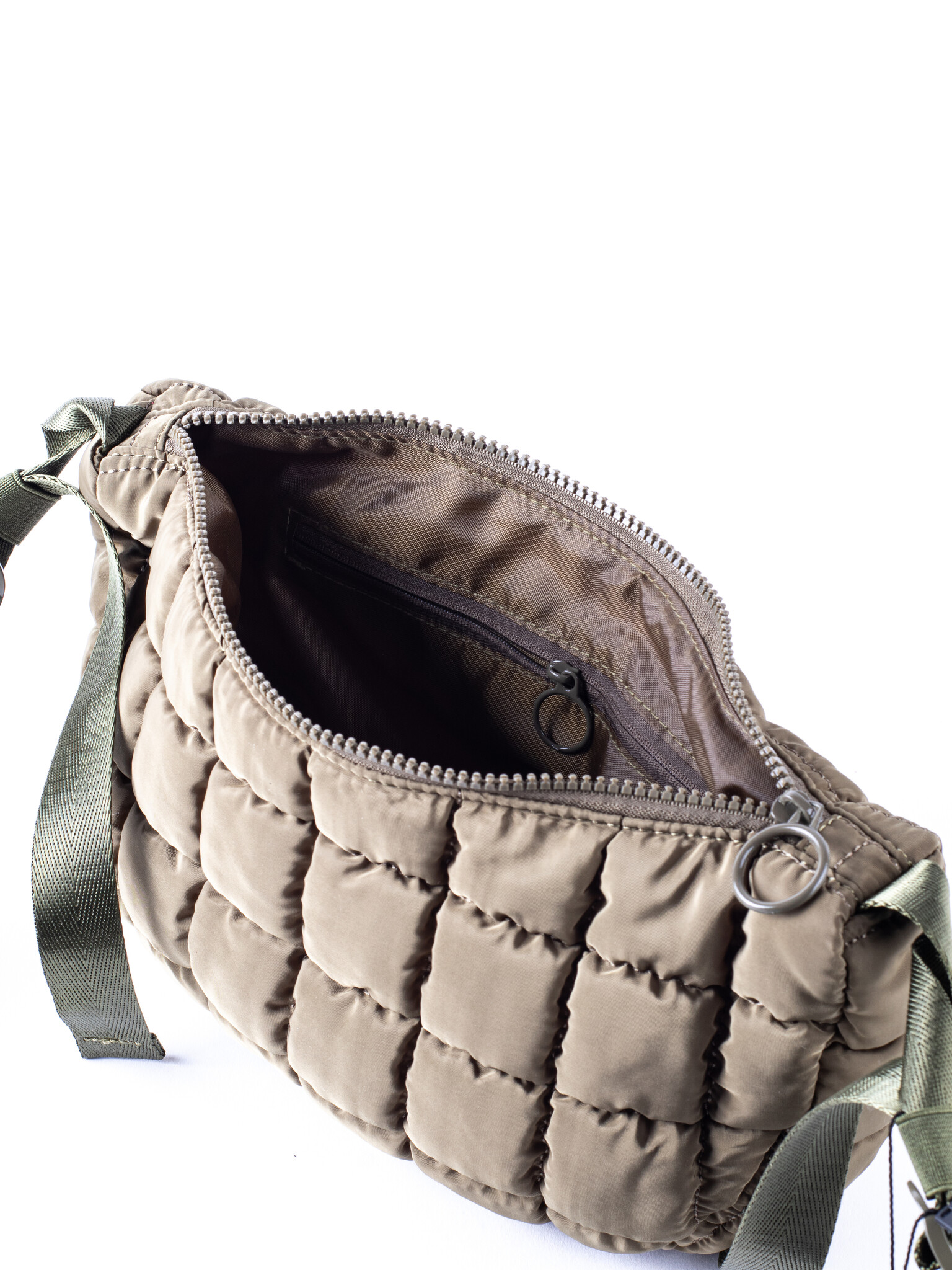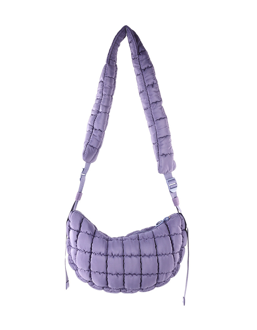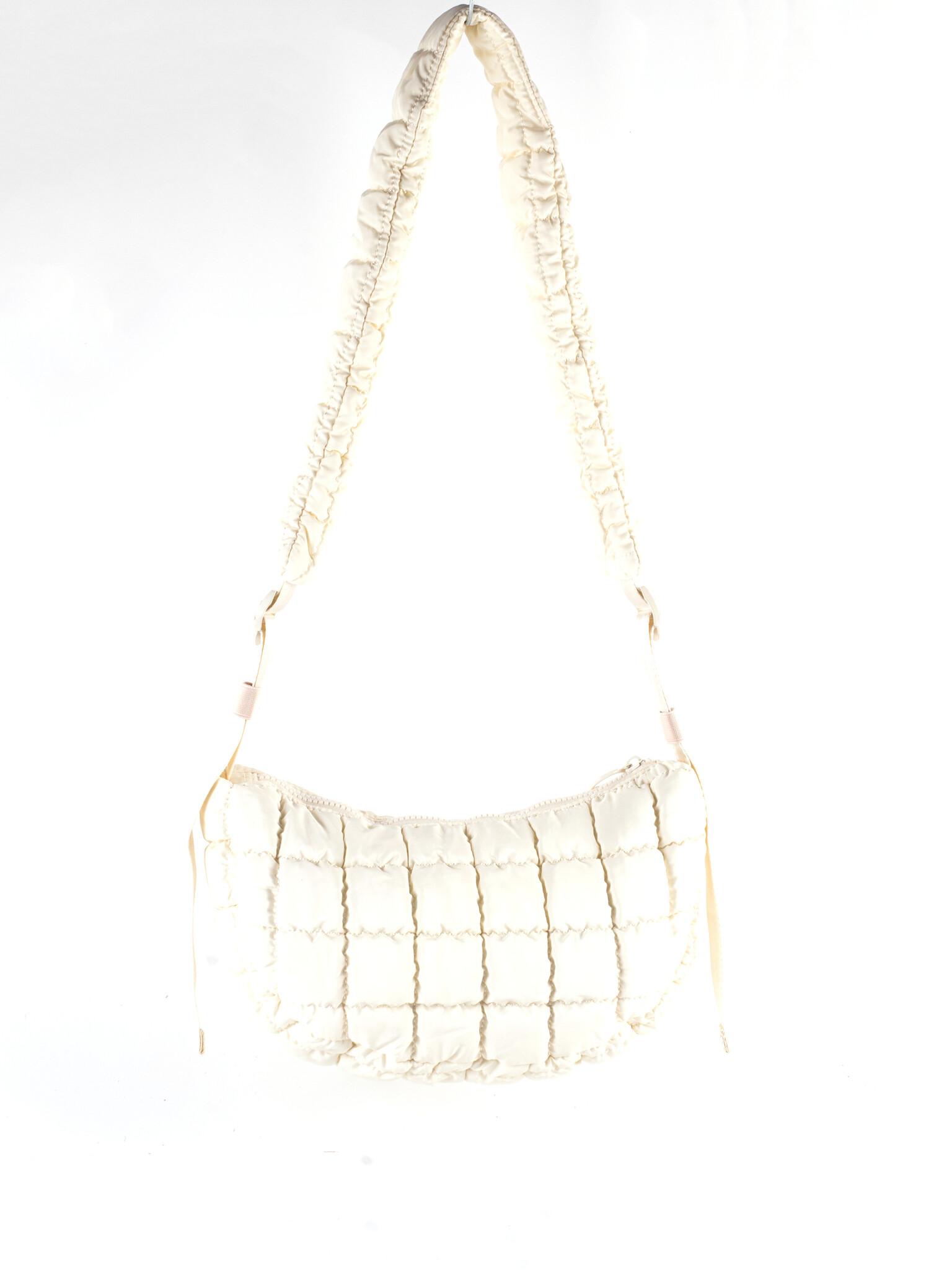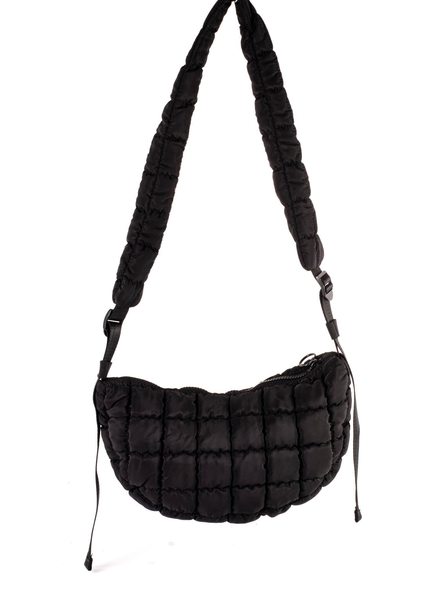 • Quilted crescent-shaped shoulder bag with a stitched design, a comfortable strap, and a waterproof lining.