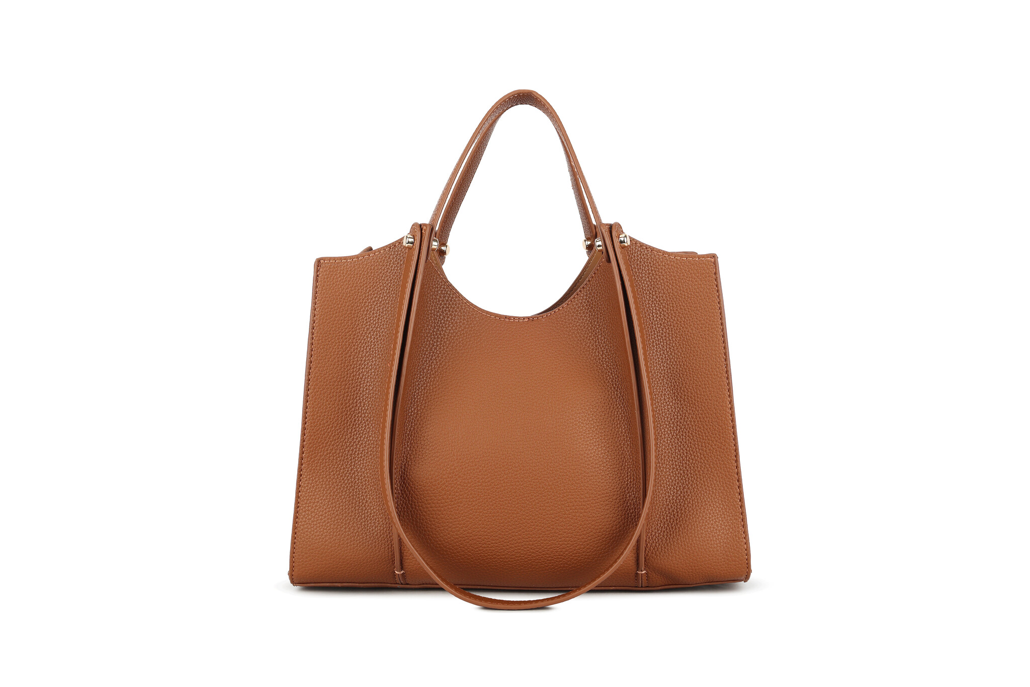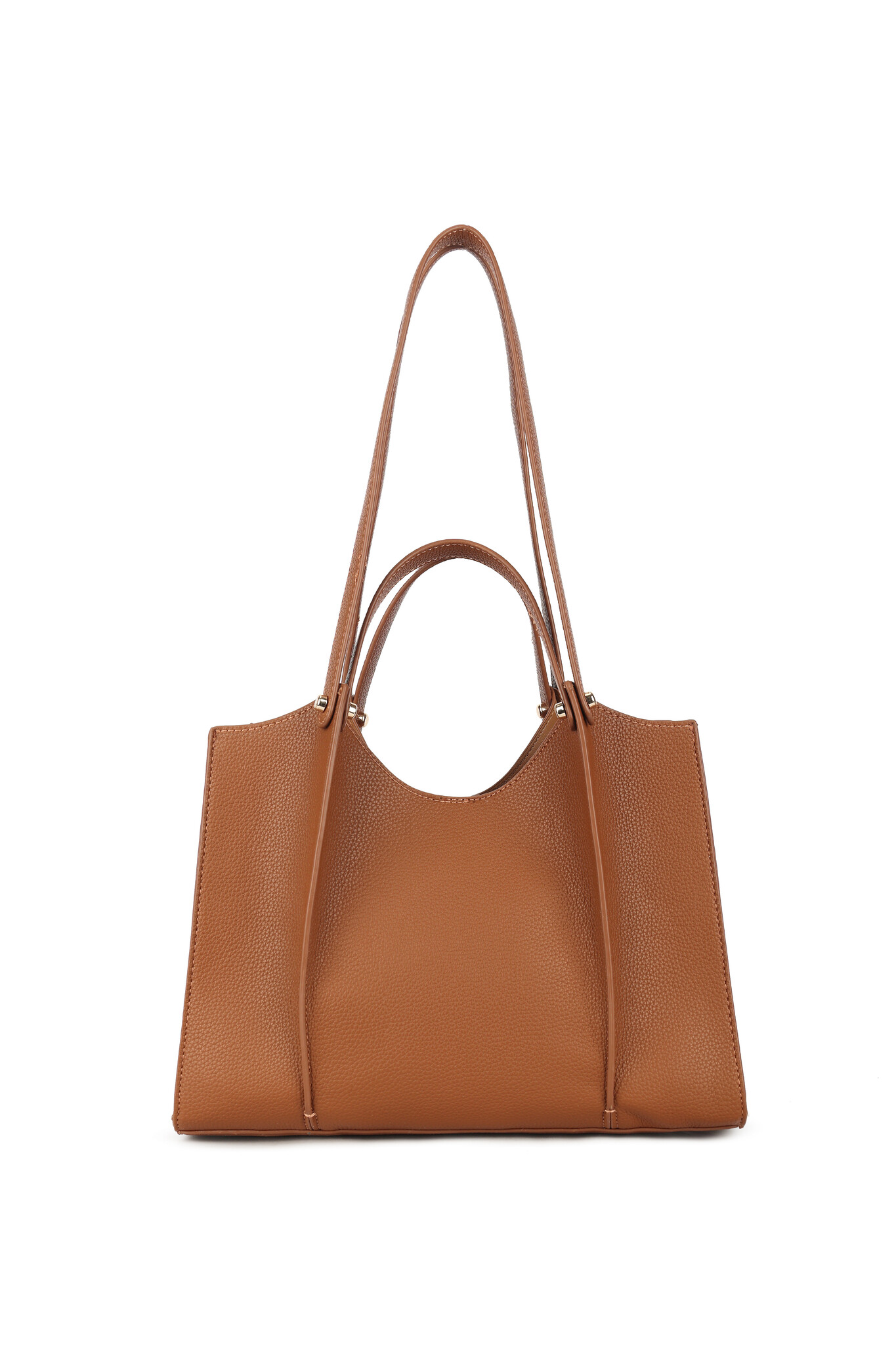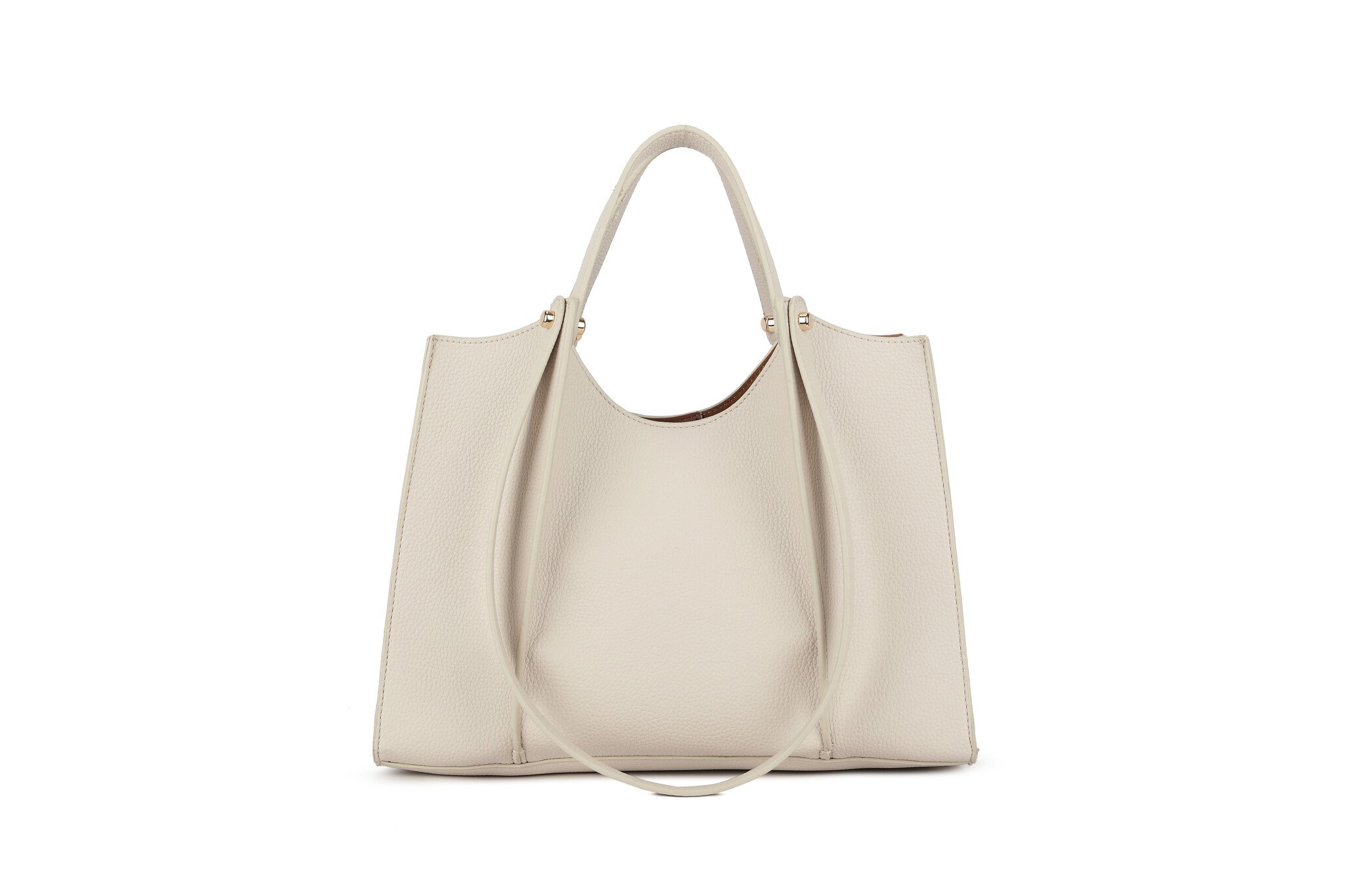 • Modern and elegant handbag with a grainy textured finish. The bag features both long and short handles, giving it a city-chic vibe. It includes two inner compartments, one of which has a zipper closure.