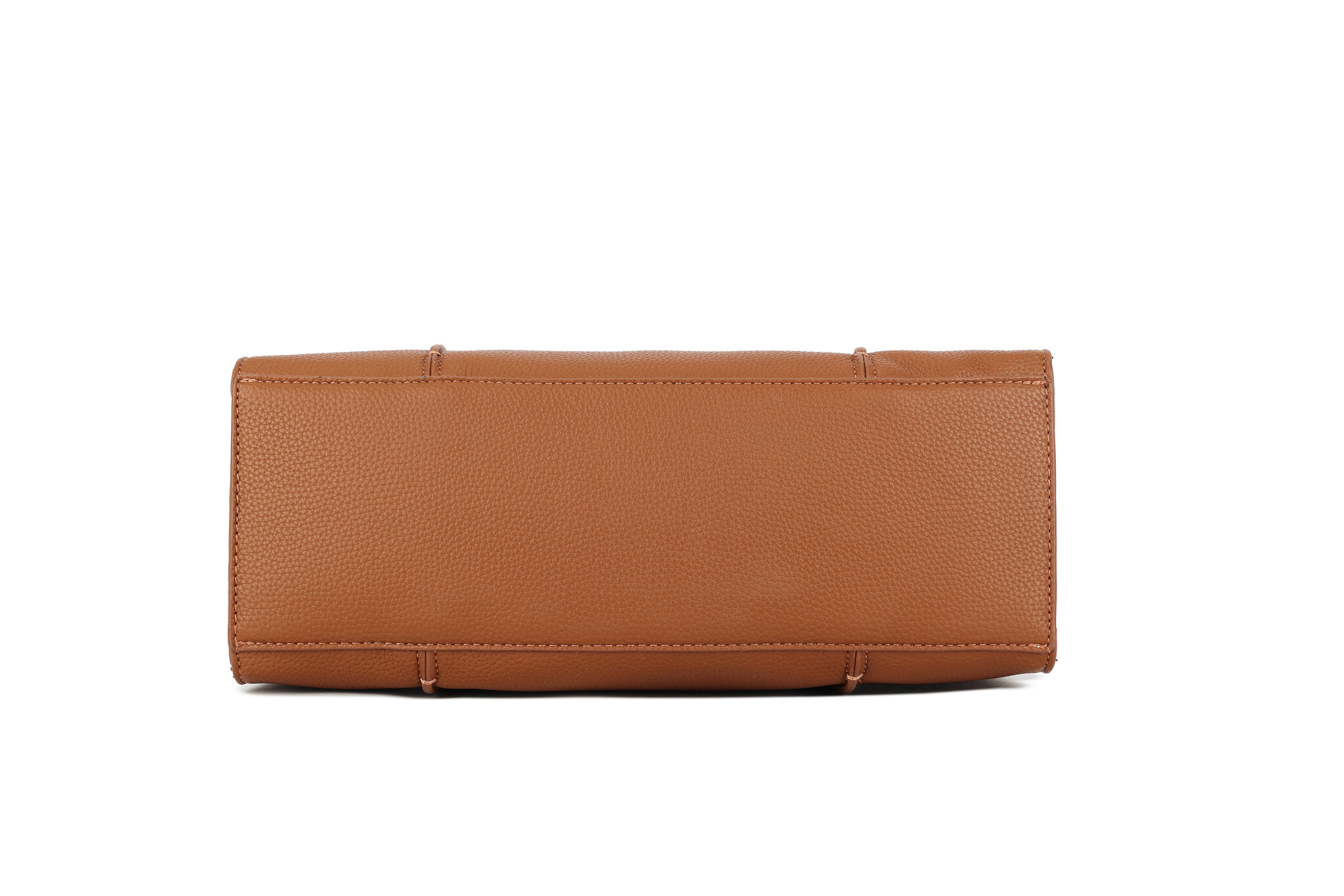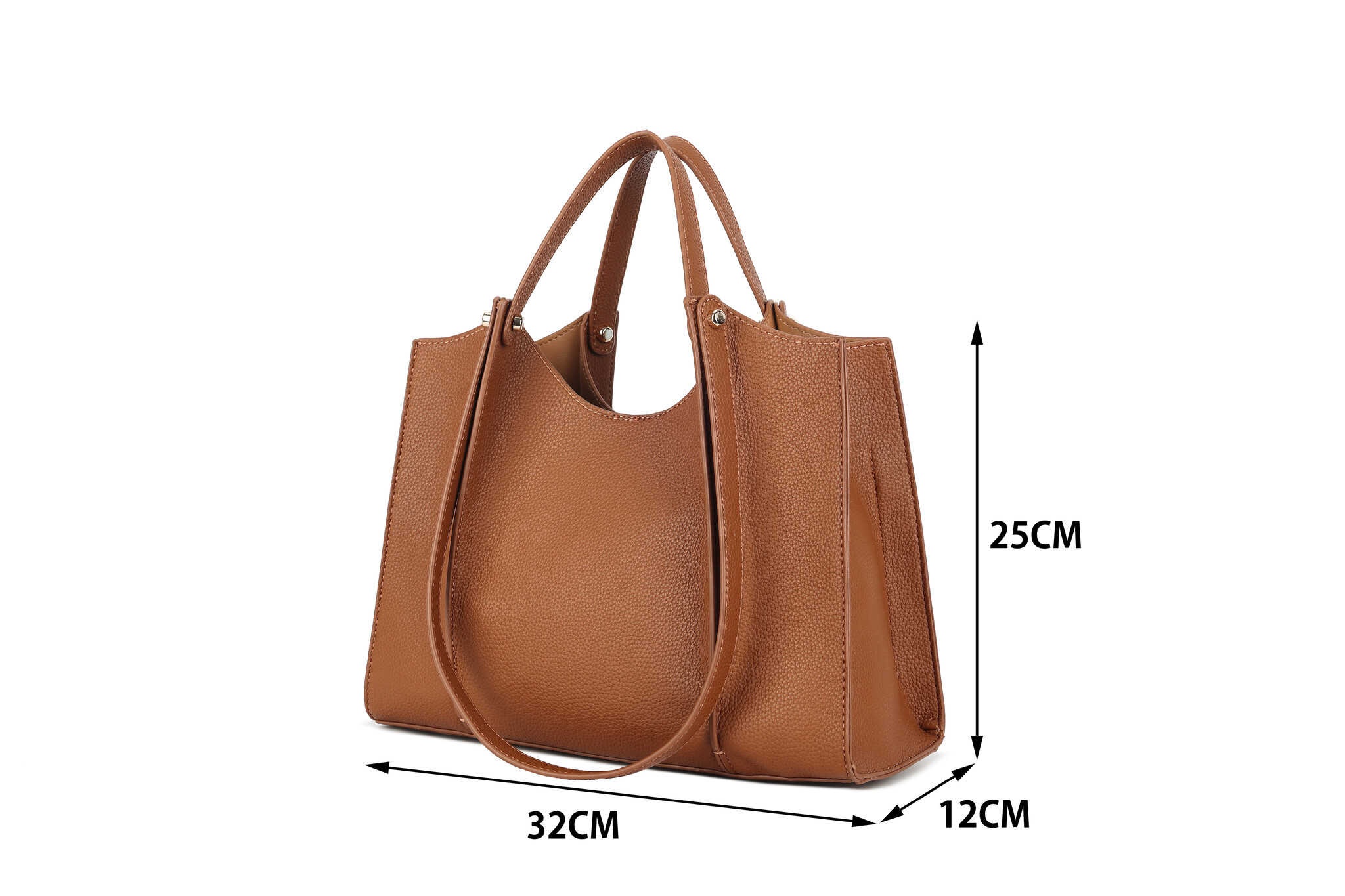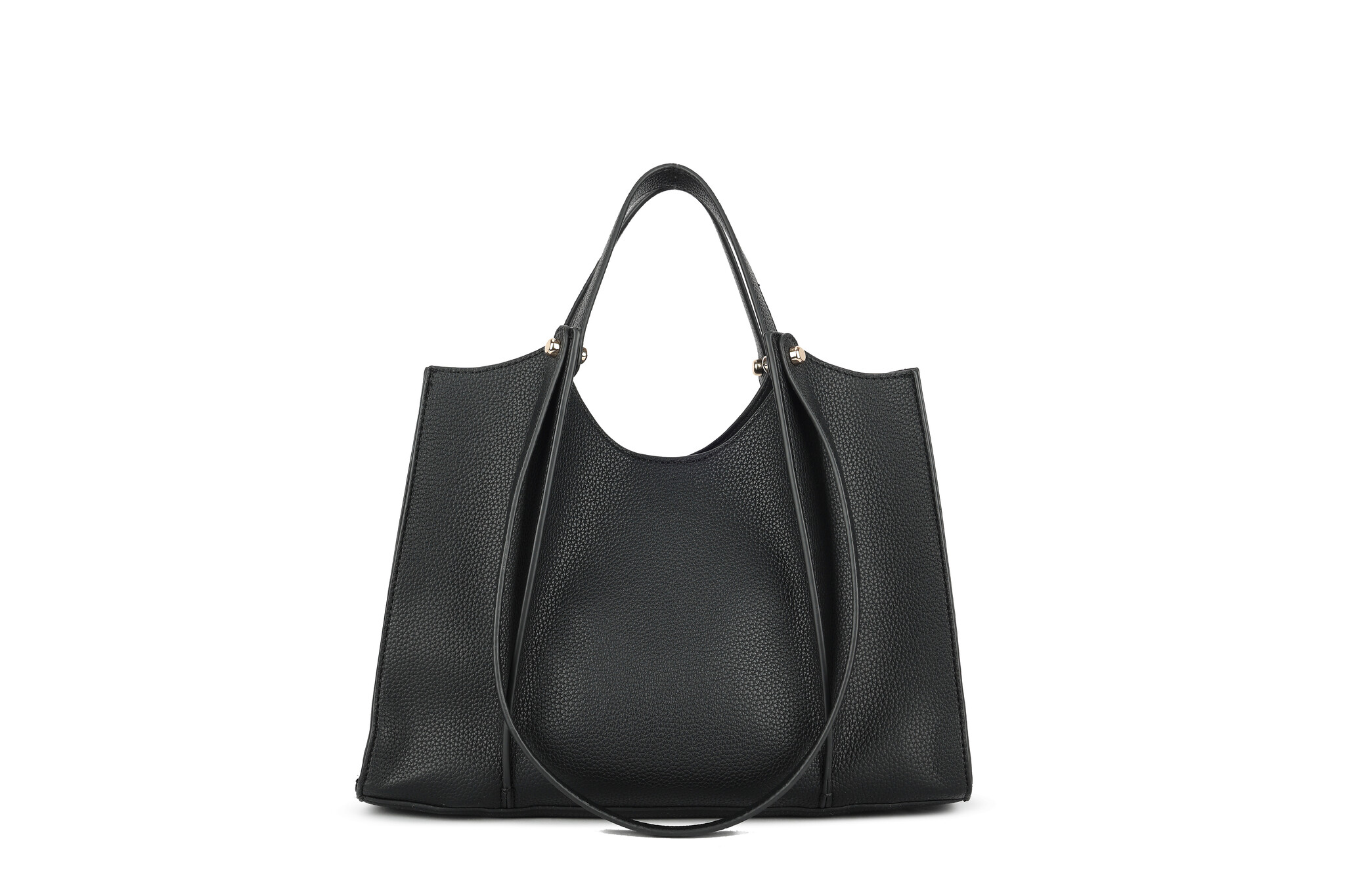 • Modern and elegant handbag with a grainy textured finish. The bag features both long and short handles, giving it a city-chic vibe. It includes two inner compartments, one of which has a zipper closure.