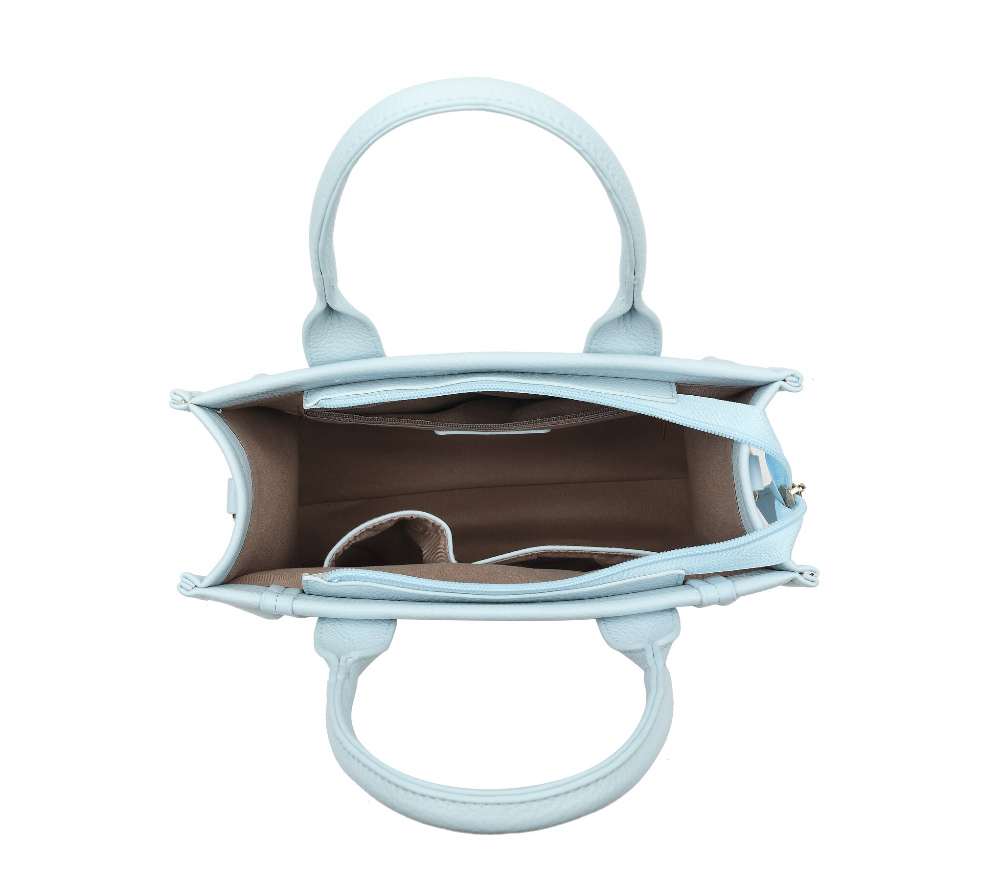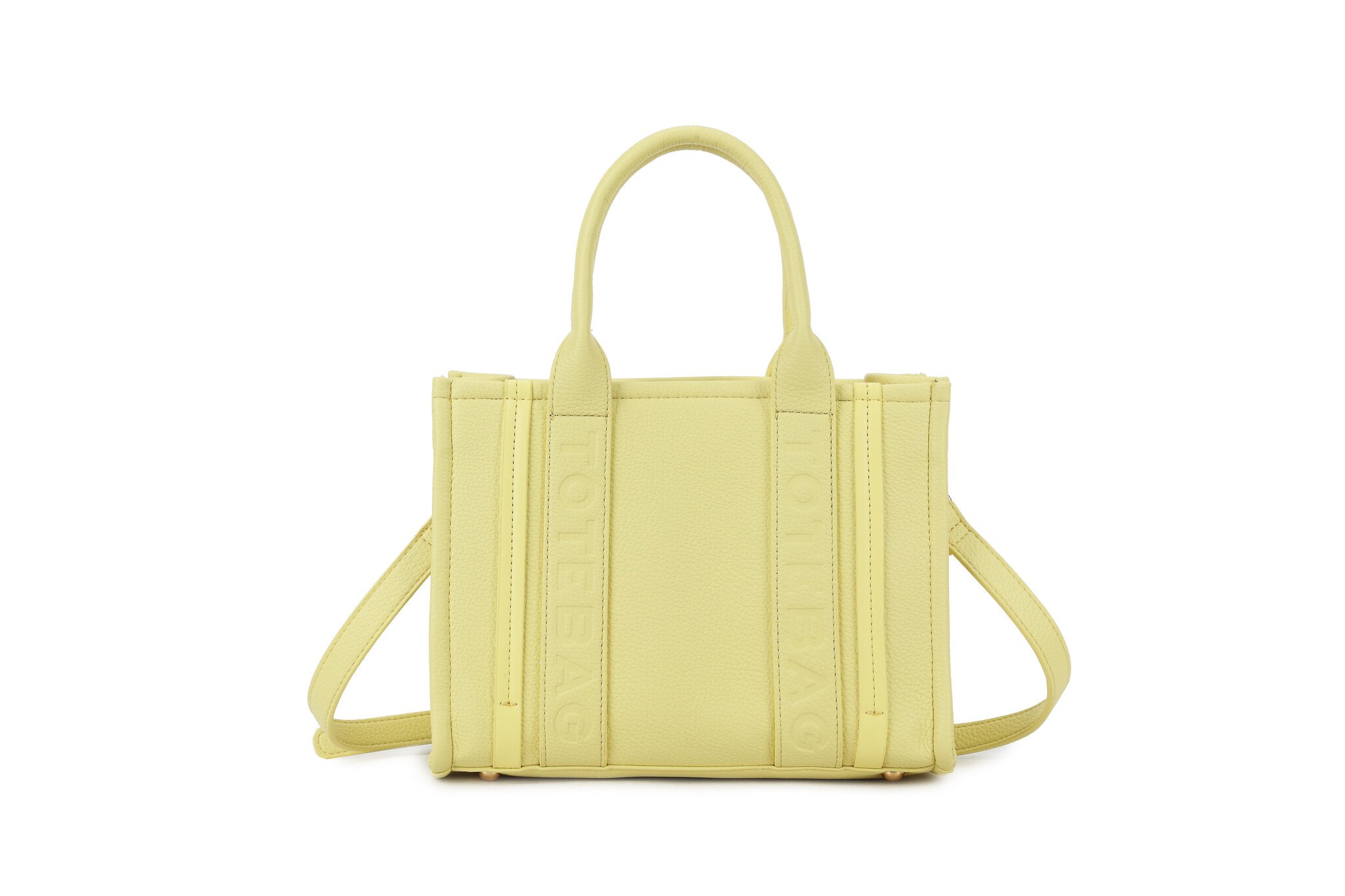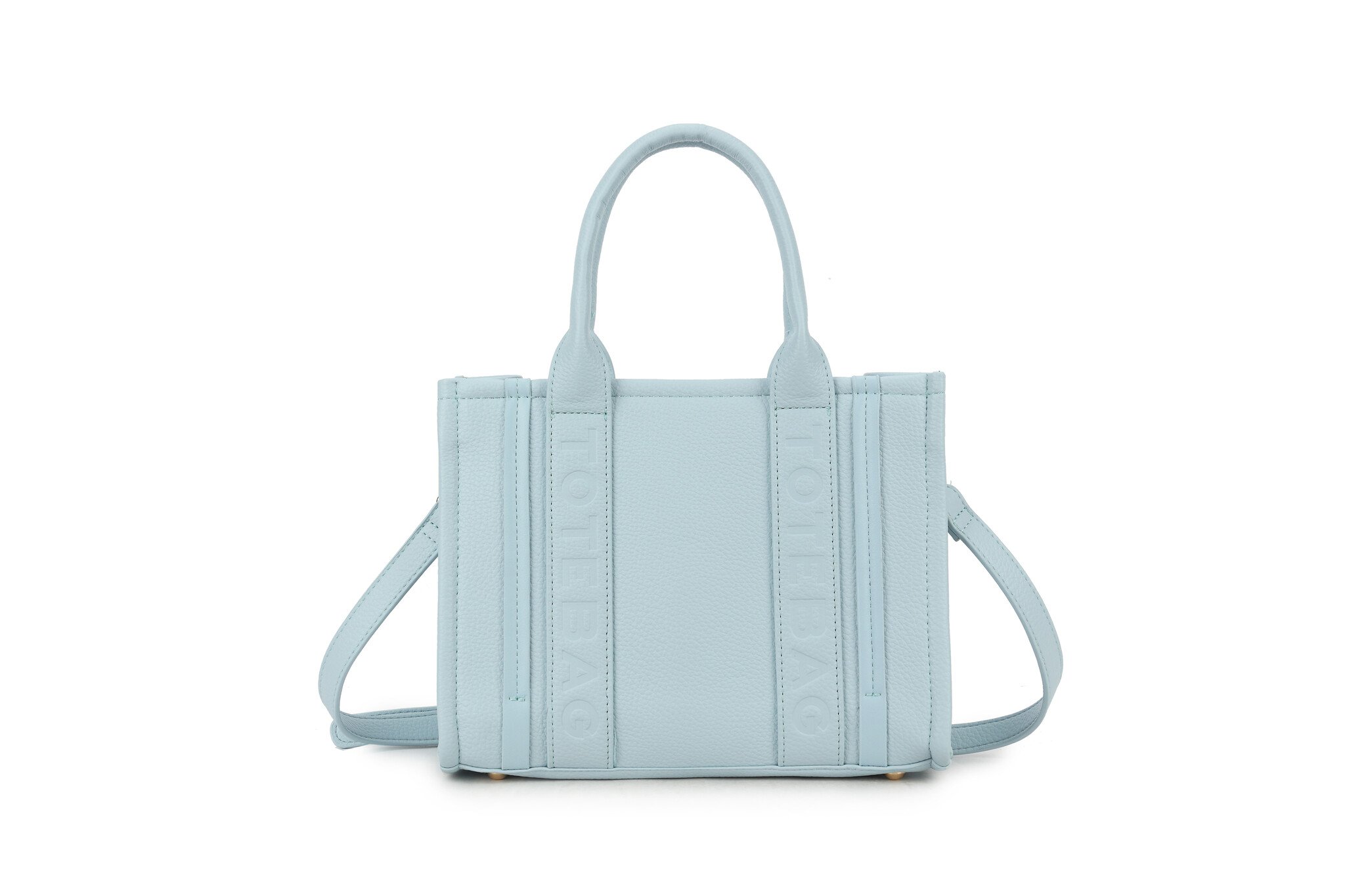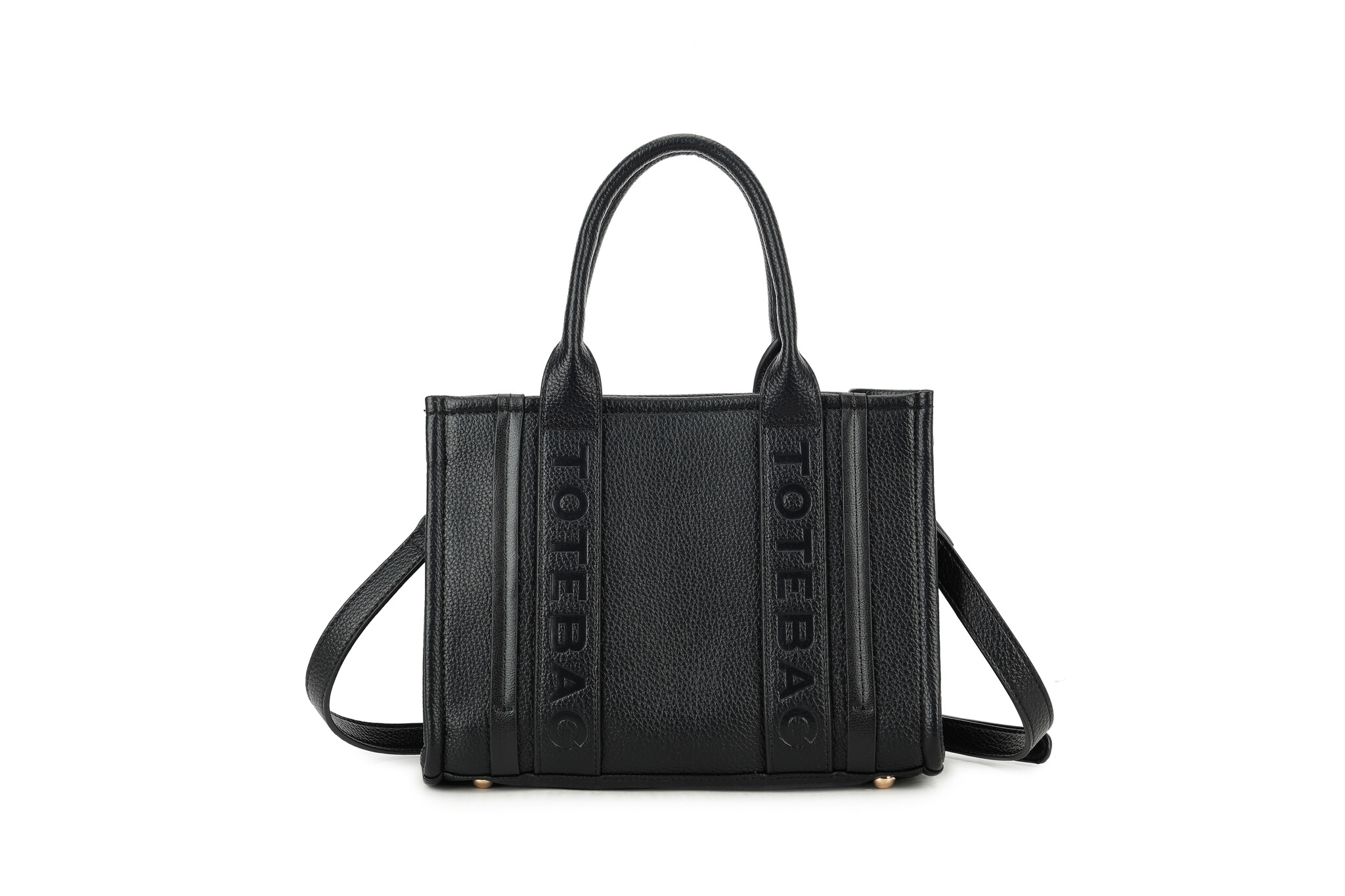 Faux leather handbag with 'TOTE BAG' text on the straps. Comes with a detachable and adjustable shoulder strap. Features 3 inner pockets (1 with zipper), zigzag lining, and metal studs on the bottom. Stylish and functional.