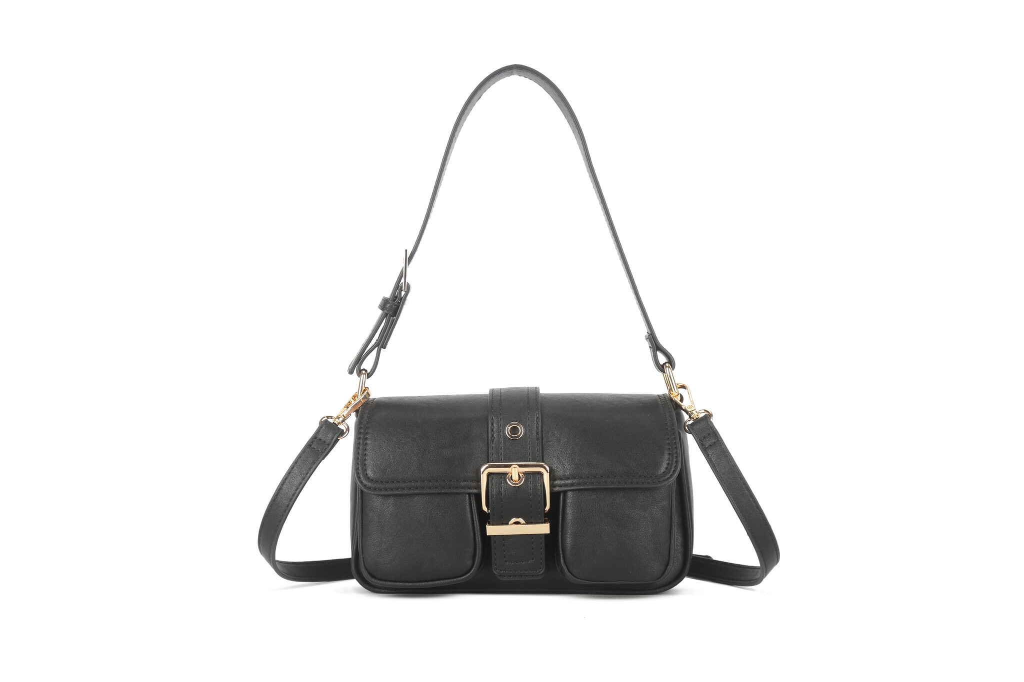 Shoulder bag with a retro look inspired by the '60s and '70s. The gold buckle adds a modern touch that contrasts beautifully with the bag’s classic silhouette. Hidden beneath the buckle is a magnetic closure. The bag features 2 inner and 2 outer pockets.