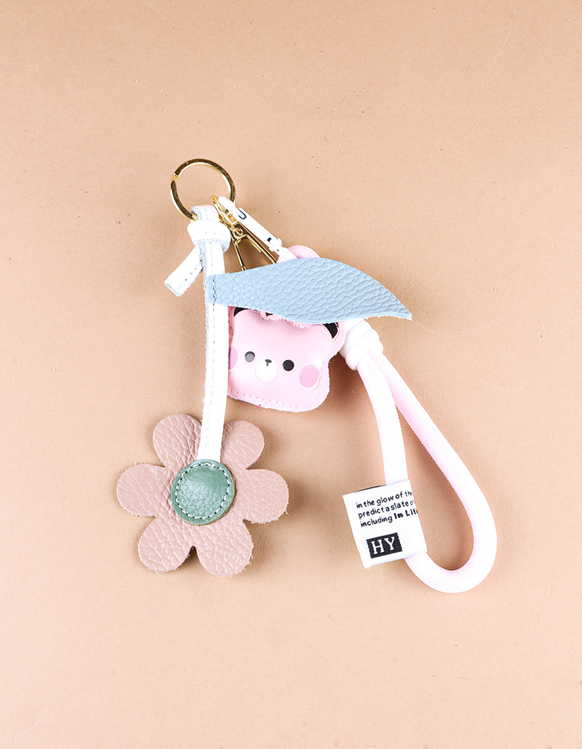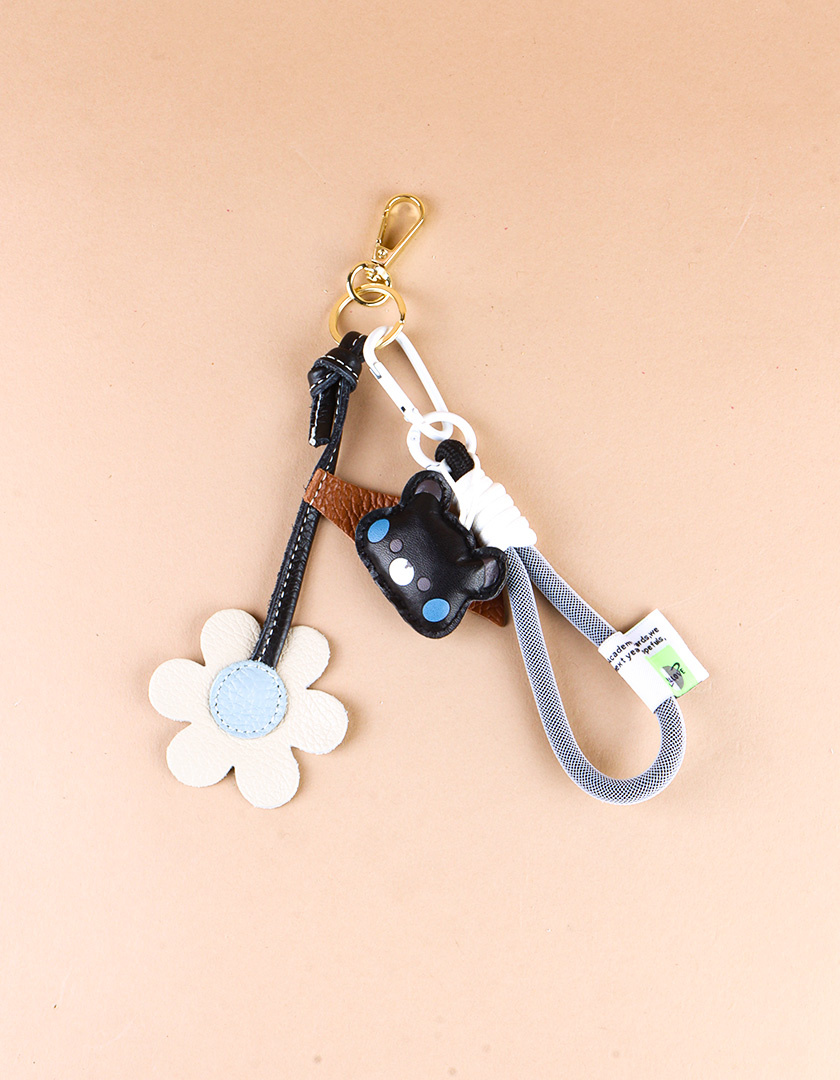• Cheerful and sweet keychain/bag tag with animal face and leather flower.