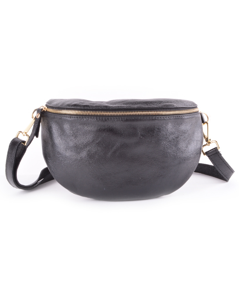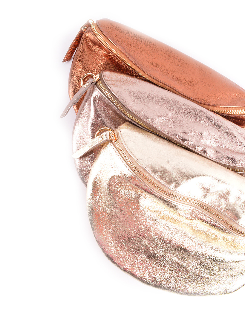 • Leather metallic beltbag with adjustable and removable strap. On the back side there is 1 more compartment with zipper closure where you can storage your stuff.