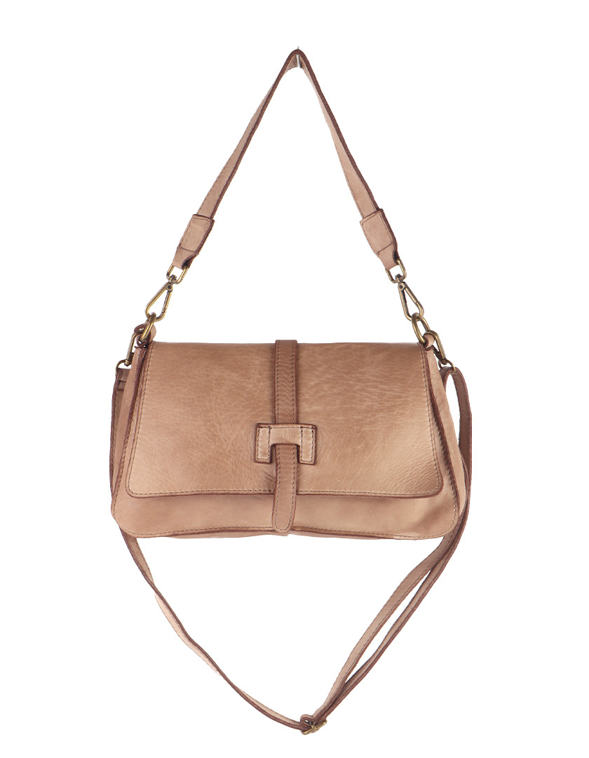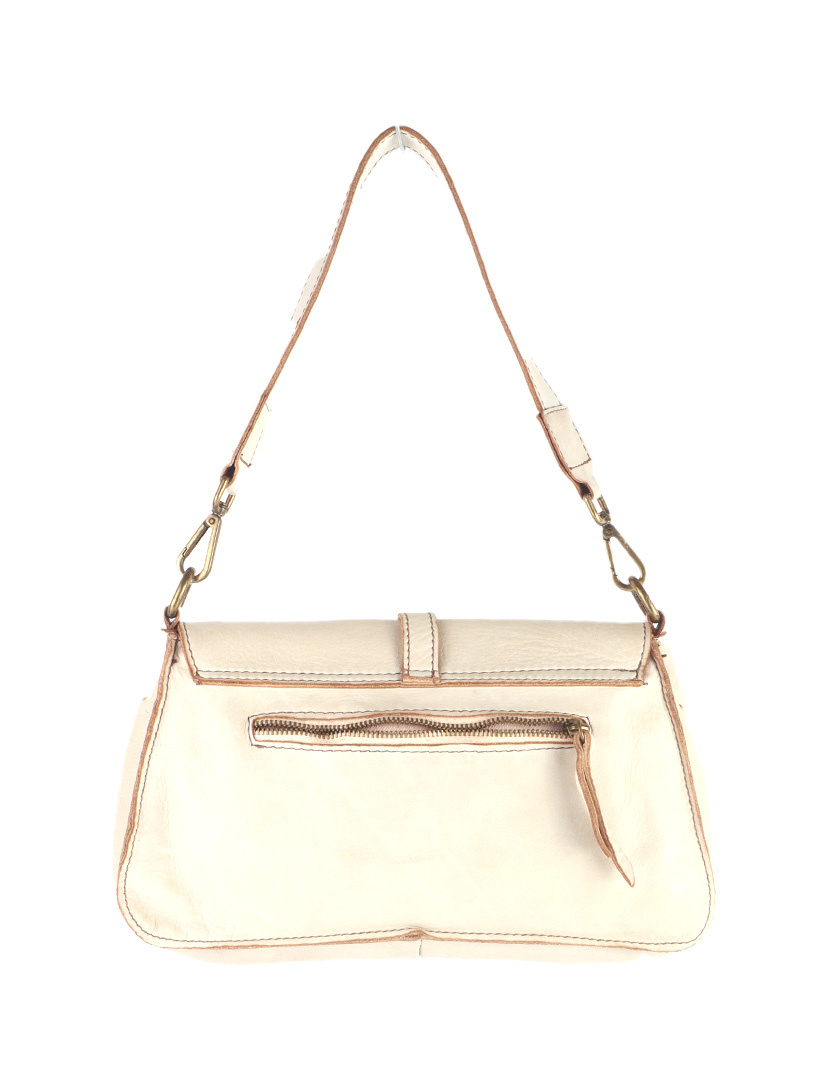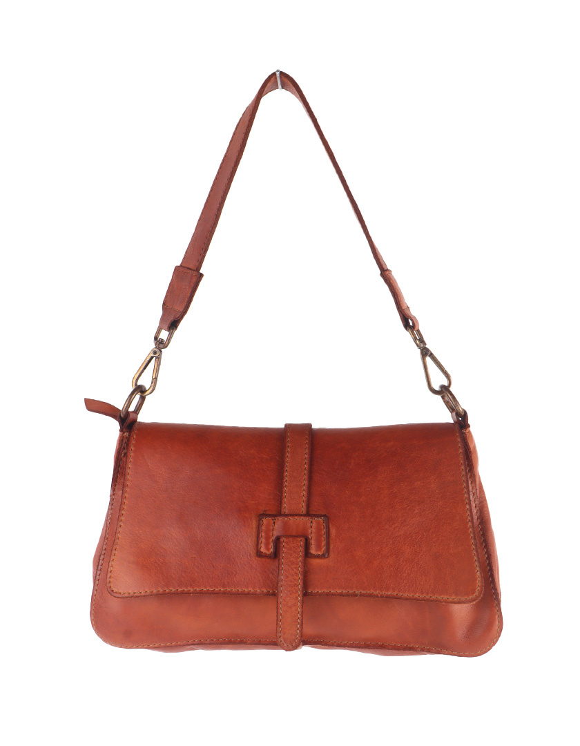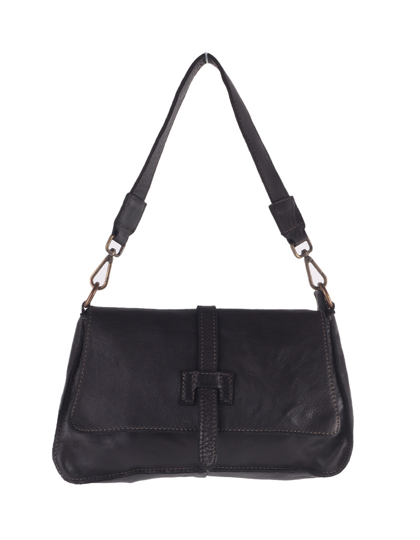 • Washed leather handbag with a removable and adjustable shoulder strap. Additionally, there is a second, shorter removable strap. The bag closes with a zipper but also has a magnetic closure under the flap. A decorative clasp is featured on the flap.