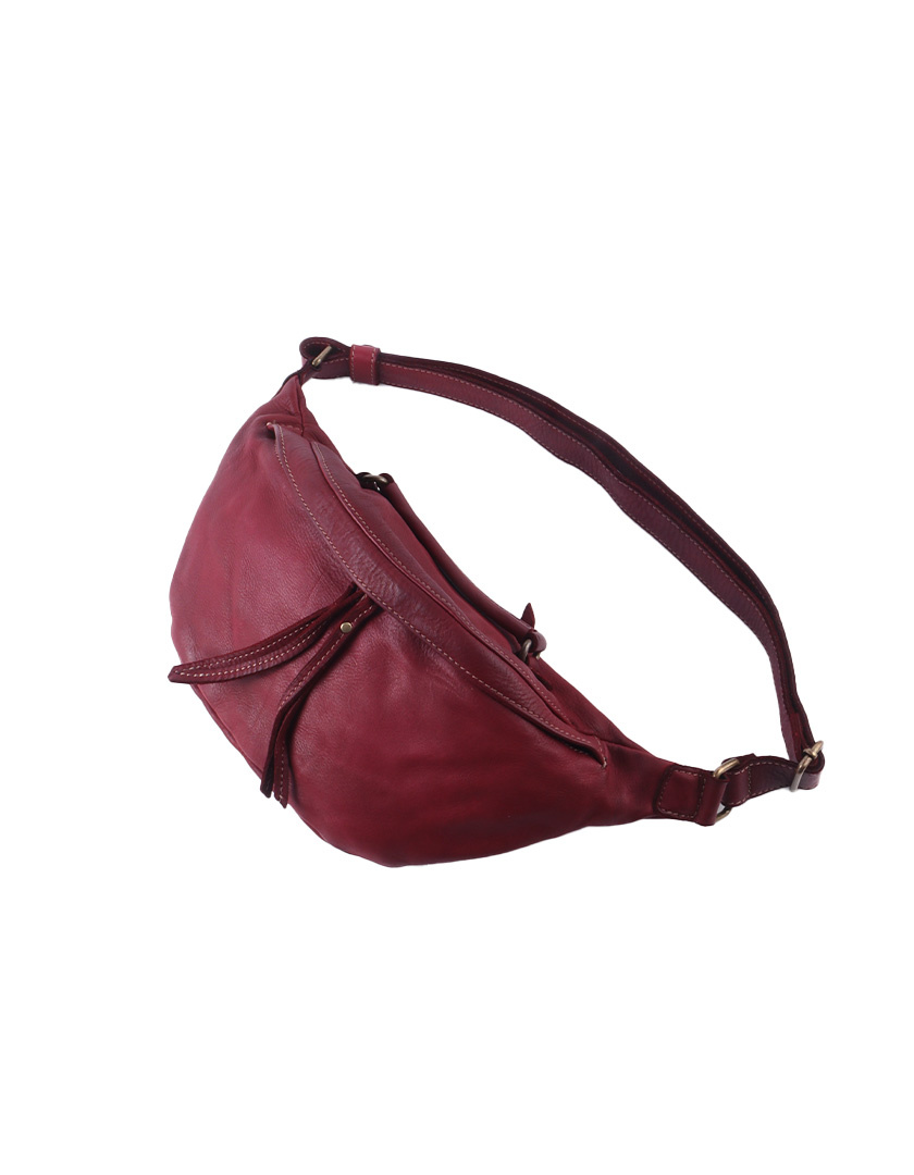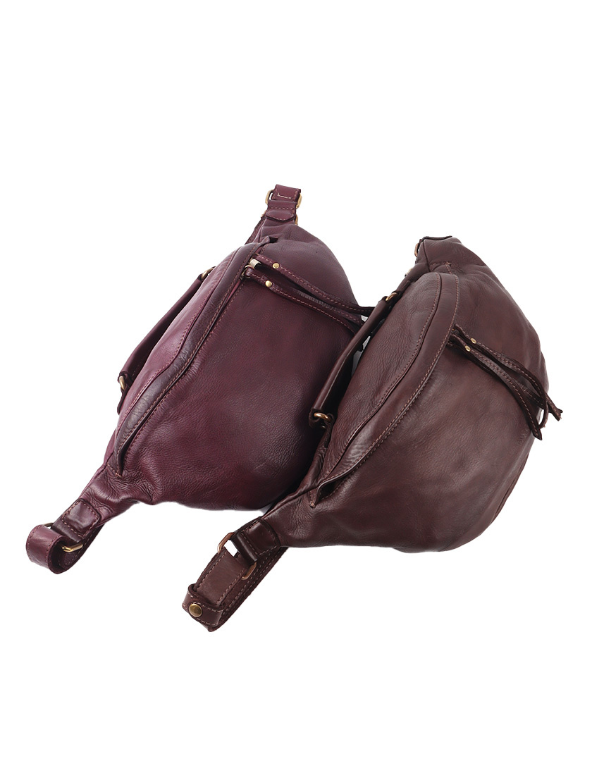 • Leather handbag that closes with a zipper. Inside the bag are three compartments.