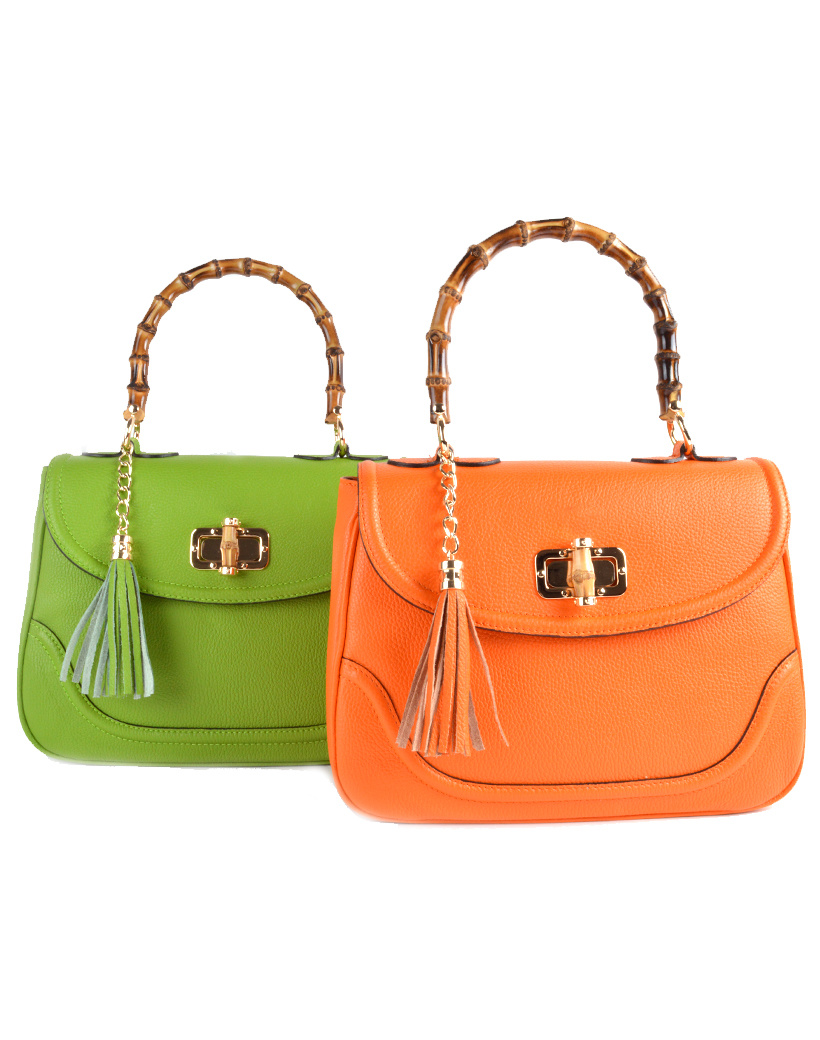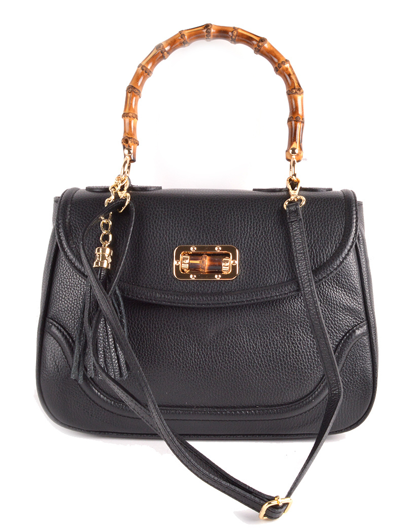 • Leather handbag with a bamboo handle and twist closure. The bag has a detachable and adjustable shoulder strap.