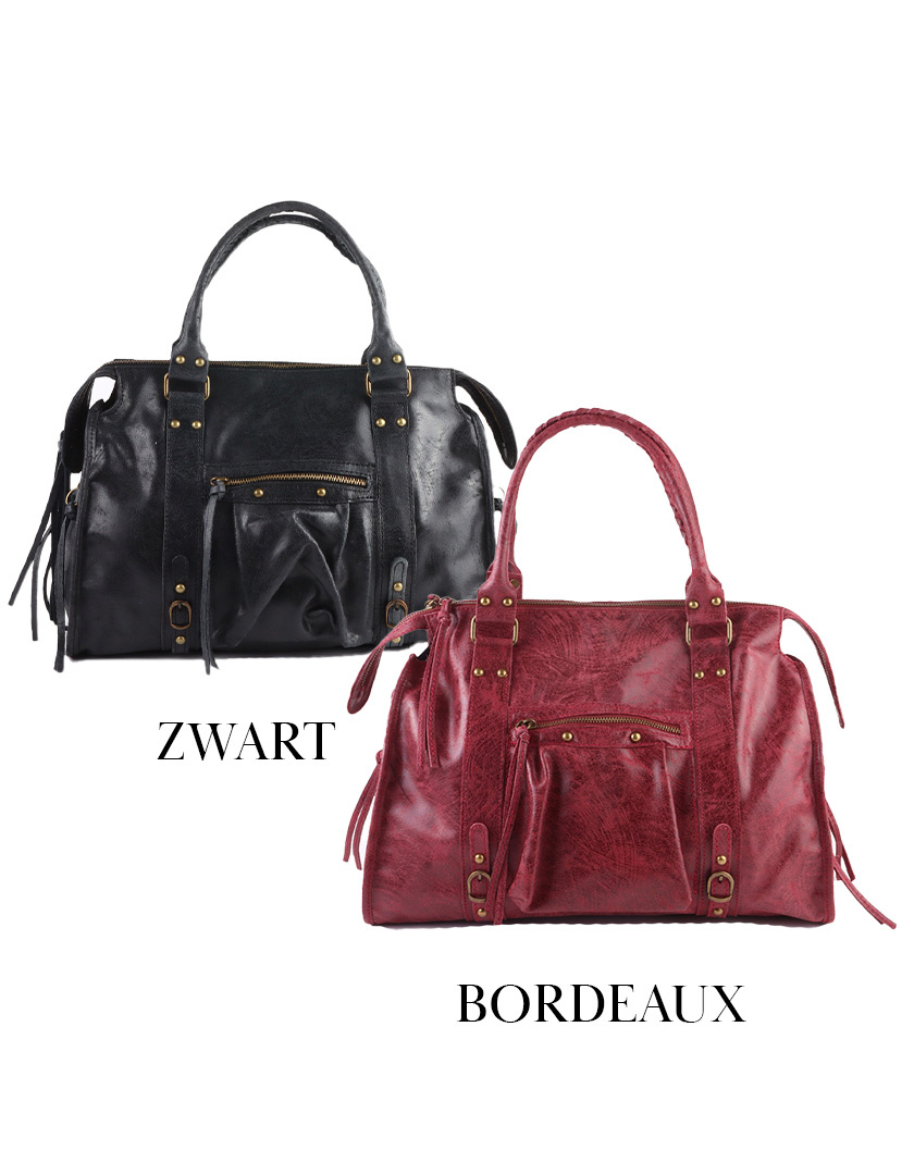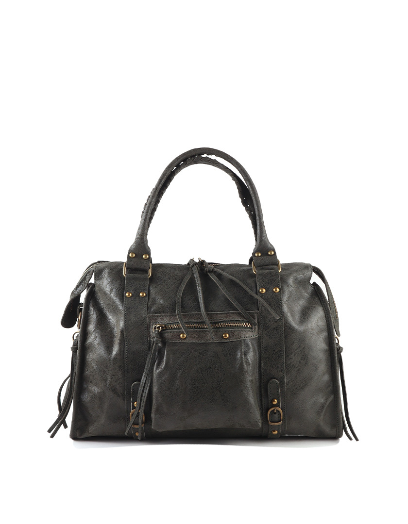 Leather shoulder bag with a large zipper and a pocket on the front. The bag also has a detachable shoulder strap. The studs on this bag are round an flatter.
