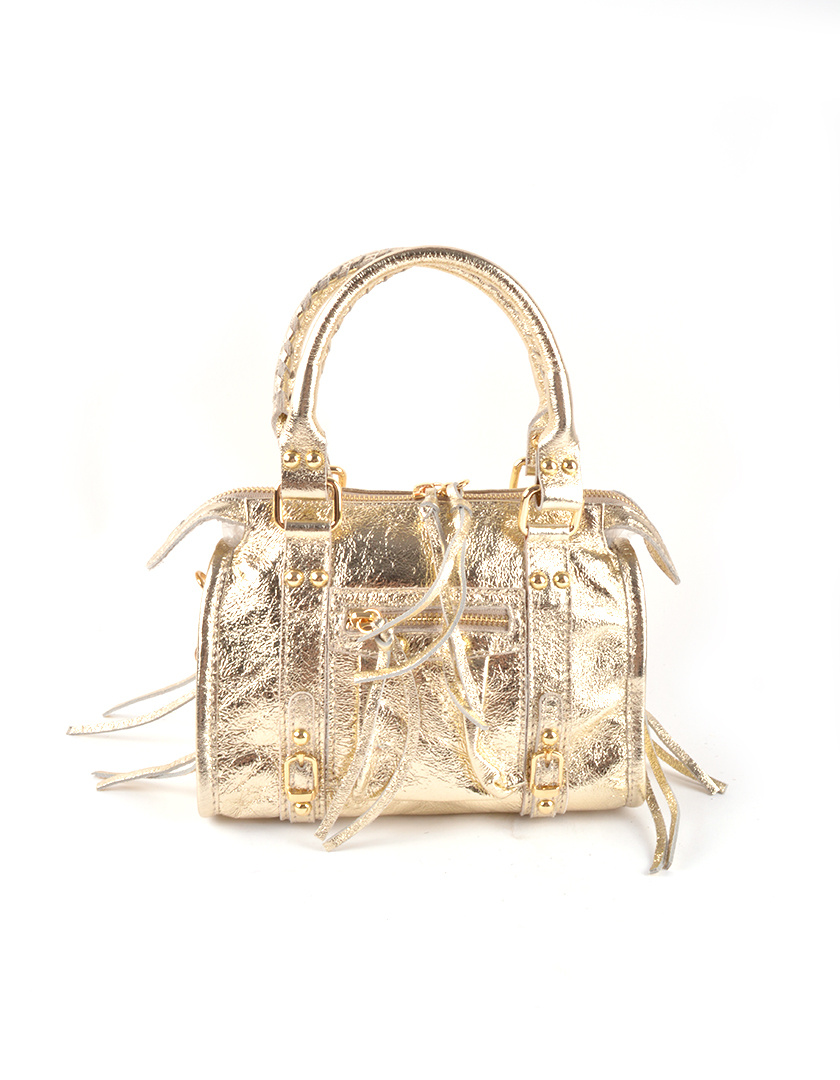 Leather metallic shoulder bag with a large zipper and a pocket on the front. The bag also has a detachable shoulder strap.