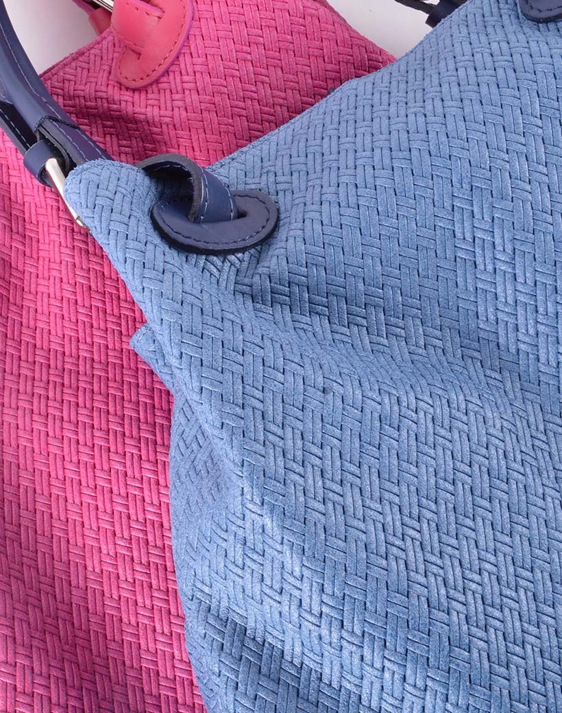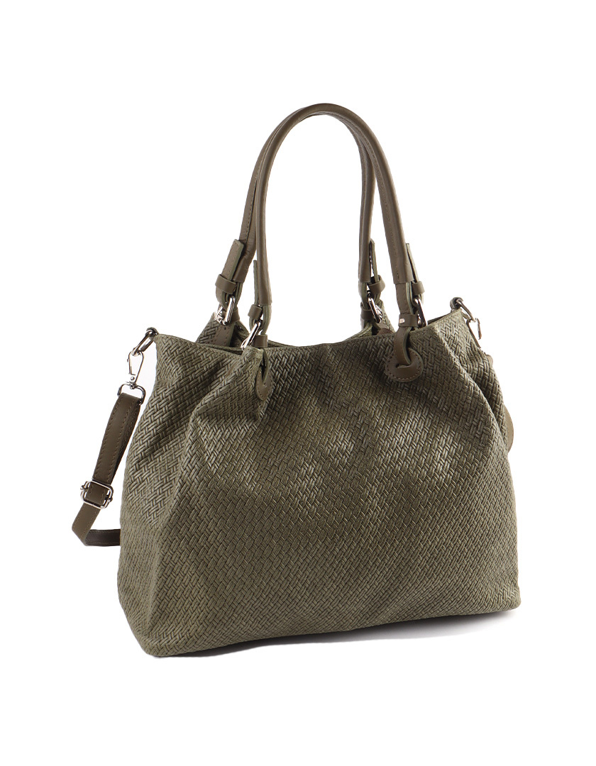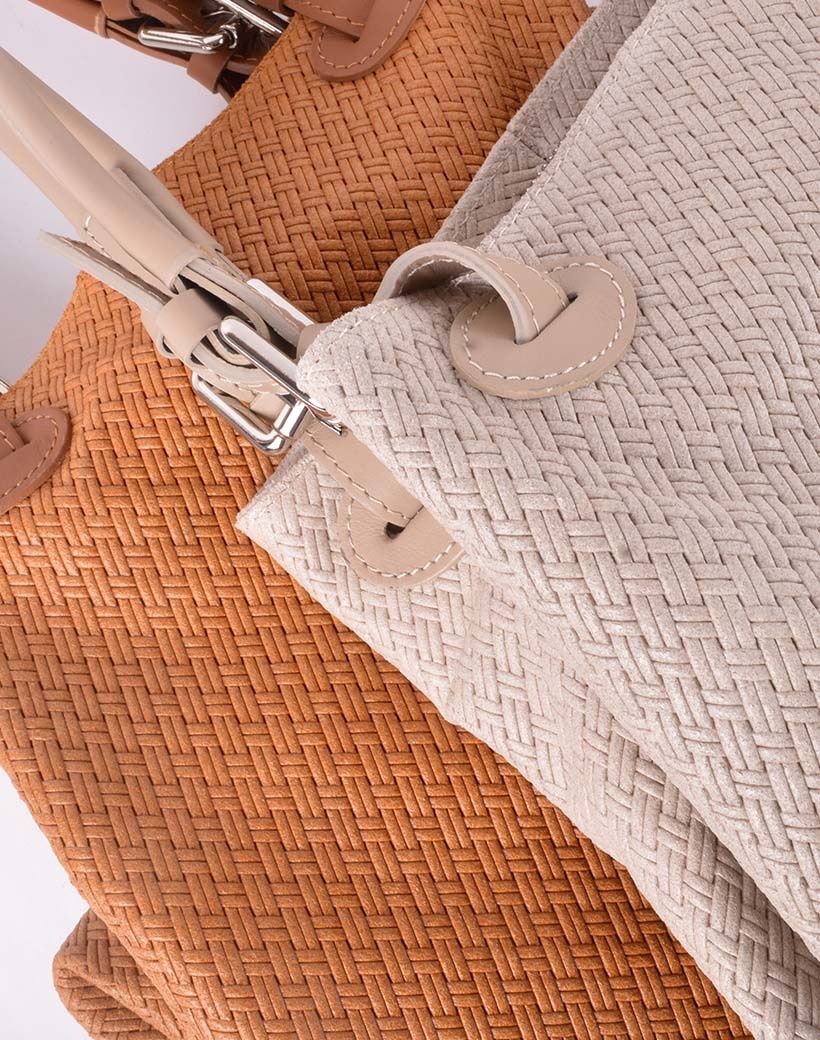 • Leather handbag with shoulder strap. The leather is pressed, this gives a unique look. The bag closes with a zipper and has a large compartment with zipper on the inside.