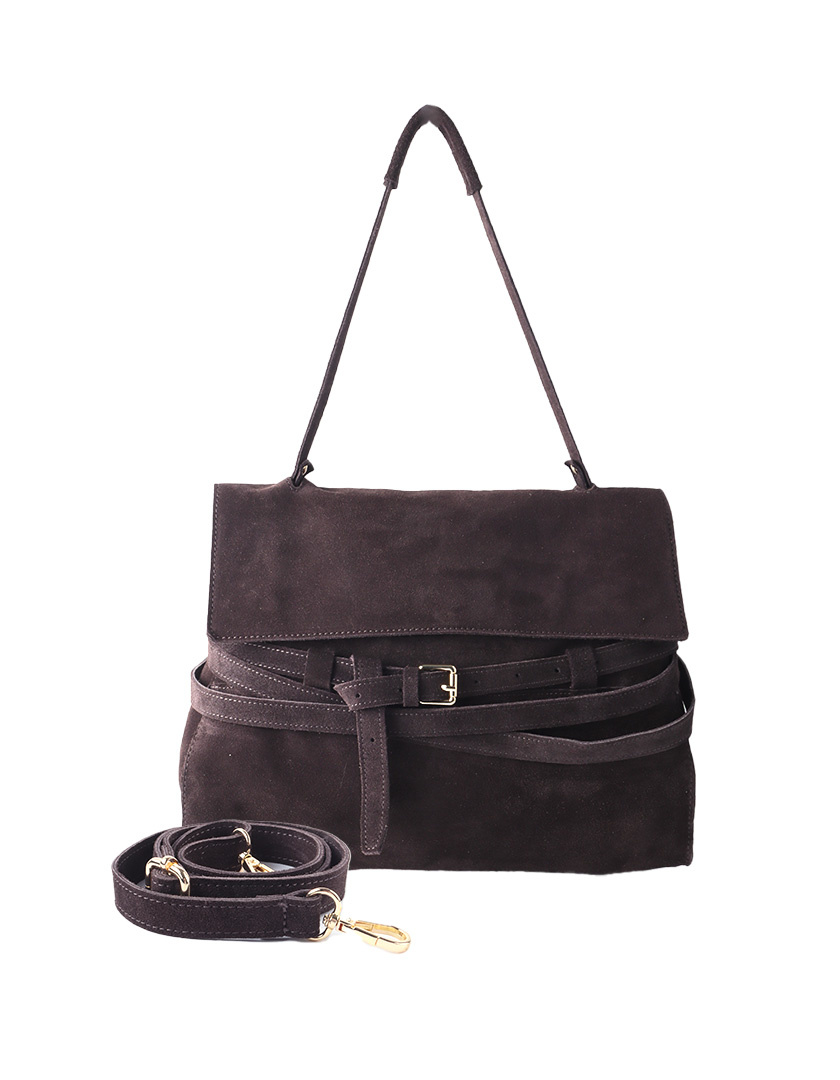 Minimalist suede shoulder bag with a soft texture and wide handle for optimal carrying comfort. The timeless design and spacious interior make this bag perfect for everyday use and stylish occasions.