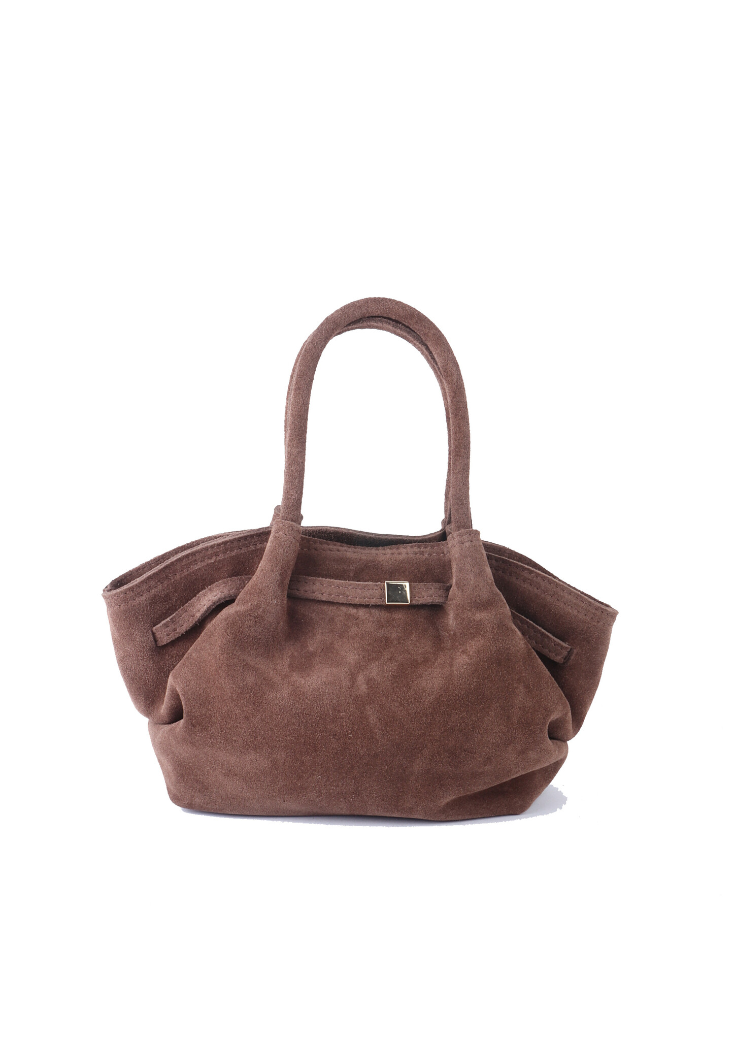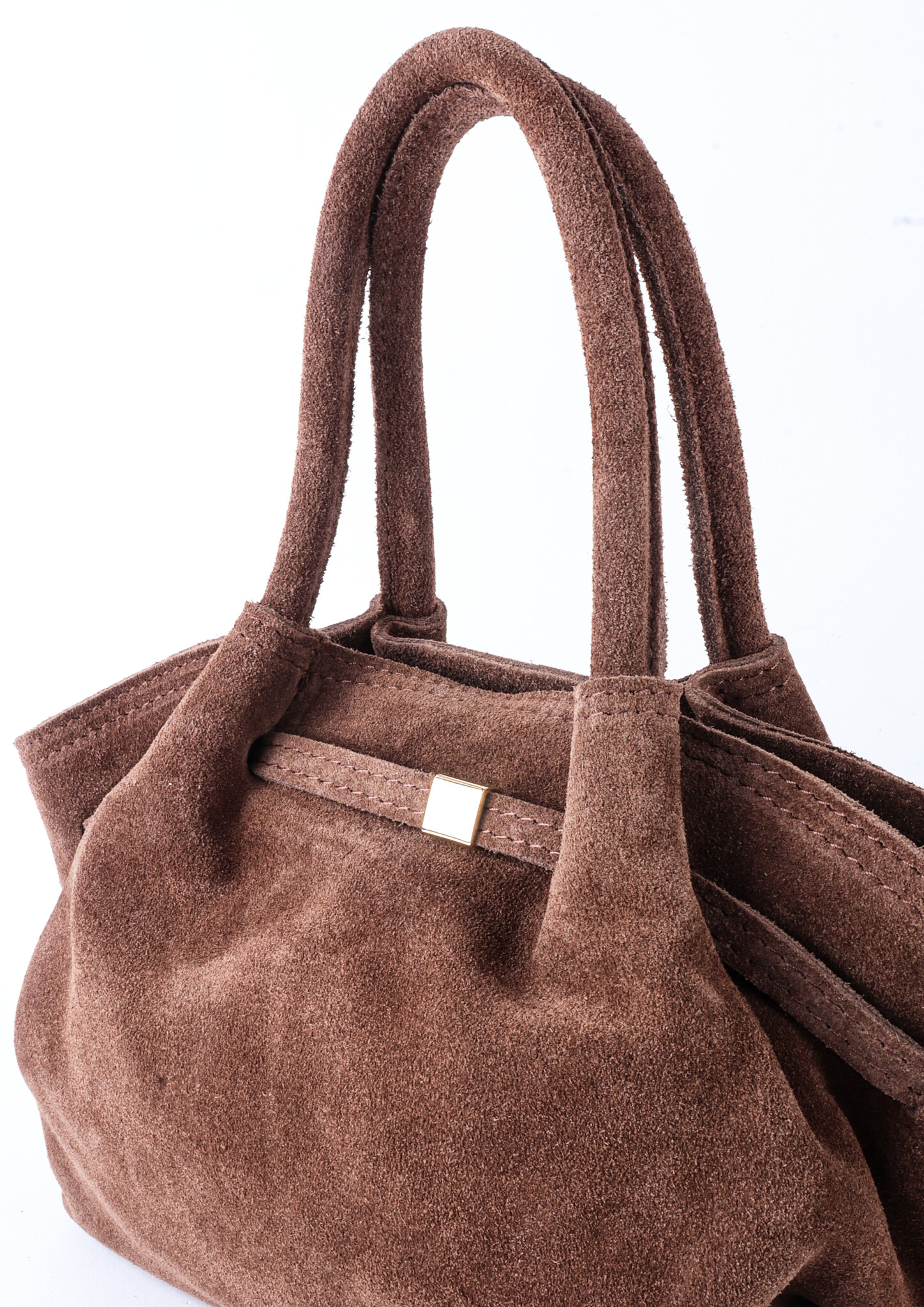 Elegant suede handbag in a rich bordeaux color, designed for a chic and timeless look. Featuring sturdy double handles, a soft and flexible structure, and a subtle metallic accent on the front. Perfectly sized to carry your daily essentials,