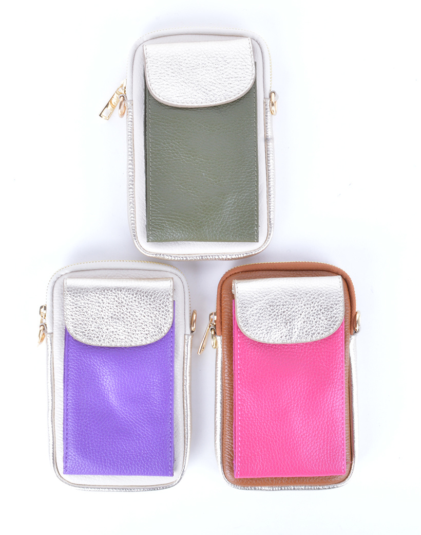 • Leather phone bag with a zipper. The bag has a front compartment that closes with a push button.