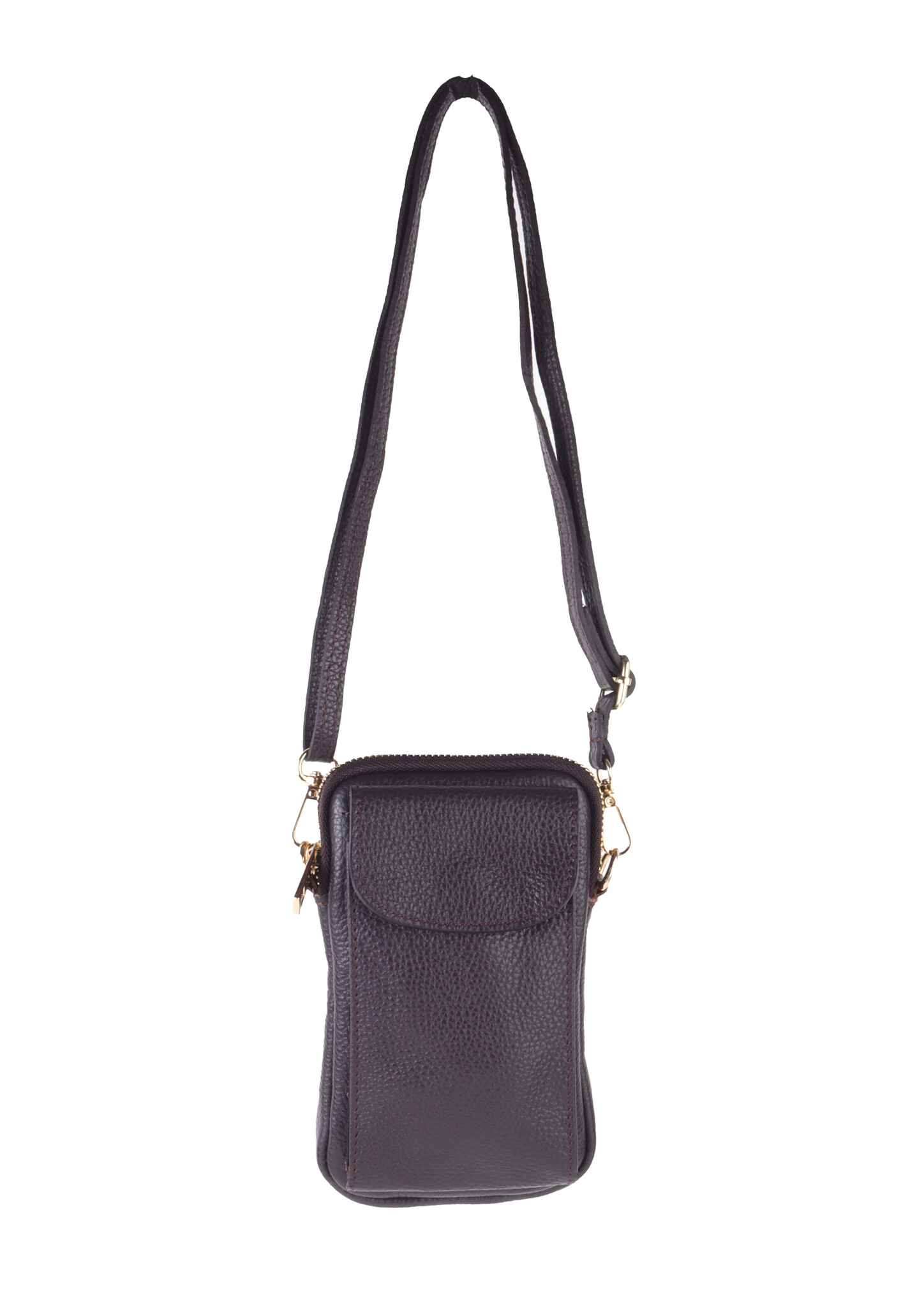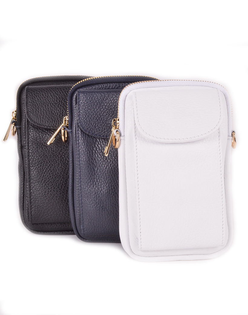 • Leather phone bag with a zipper. The bag has a front compartment that closes with a push button.