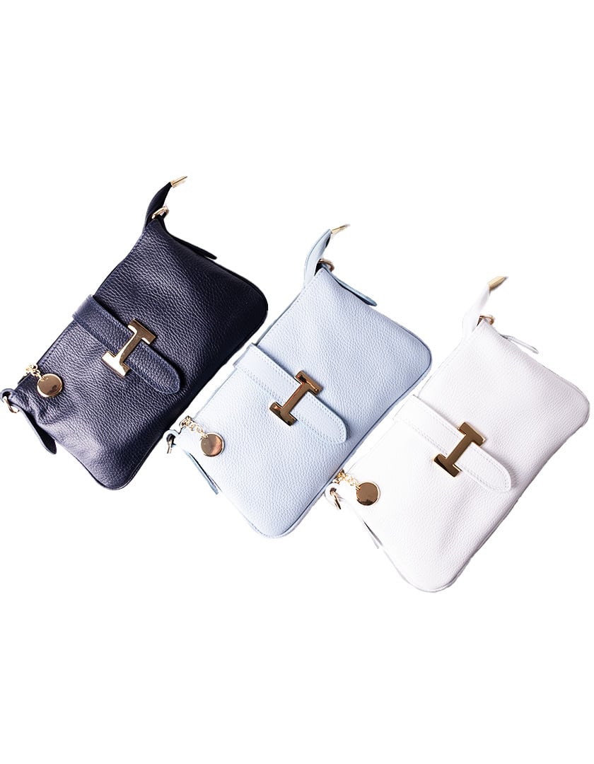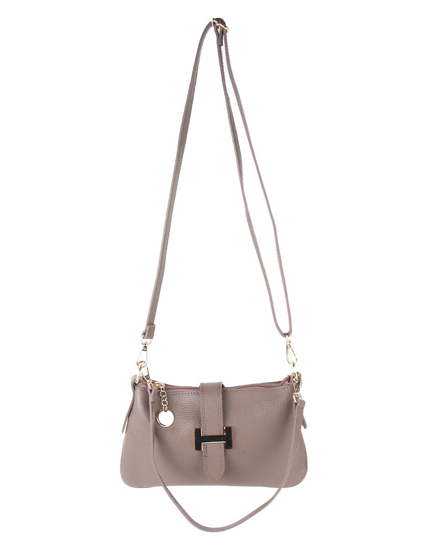 Leather shoulder bag with a gold metal "H" on the front. The bag closes with a zipper, and a leather flap runs over the top, fastening at the back with a snap button. The bag comes with two straps: one short and one adjustable.